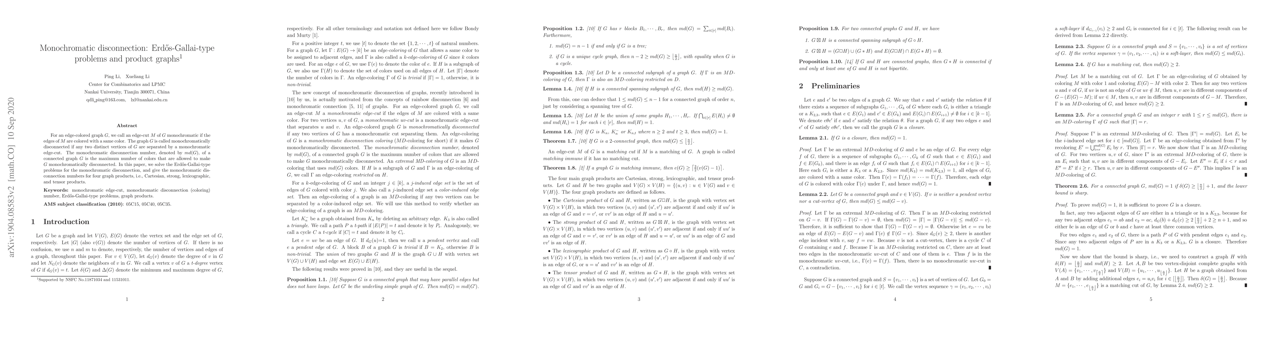 The paper solves Erdös-Gallai-type problems for monochromatic disconnection in graph products, determining the maximum number of colors needed to make any two vertices separable by a monochromatic edge-cut.