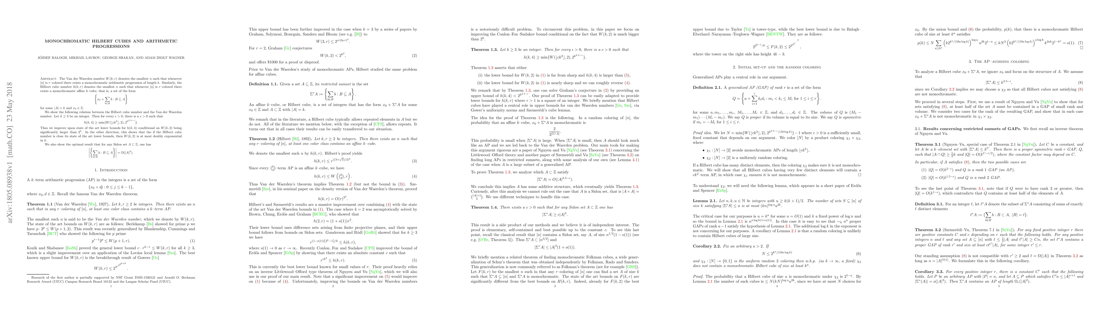 The Van der Waerden number $W(k,r)$ denotes the smallest $n$ such that whenever $[n]$ is $r$--colored there exists a monochromatic arithmetic progression of length $k$. Similarly, the Hilbert cube number $h(k,r)$ denotes the smallest $n$ such that whenever $[n]$ is $r$--colored there exists a monochromatic affine $k$--cube, that is, a set of the form$$\left\{x_0 + \sum_{b \in B} b : B \subseteq A\right\}$$ for some $|A|=k$ and $x_0 \in \mathbb{Z}$. We show the following relation between the Hilbert cube number and the Van der Waerden number. Let $k \geq 3$ be an integer. Then for every $\epsilon >0$, there is a $c > 0$ such that $$h(k,4) \ge \min\{W(\lfloor c k^2\rfloor, 2), 2^{k^{2.5-\epsilon}}\}.$$ Thus we improve upon state of the art lower bounds for $h(k,4)$ conditional on $W(k,2)$ being significantly larger than $2^k$. In the other direction, this shows that the if the Hilbert cube number is close its state of the art lower bounds, then $W(k,2)$ is at most doubly exponential in $k$. We also show the optimal result that for any Sidon set $A \subset \mathbb{Z}$, one has $$\left|\left\{\sum_{b \in B} b : B \subseteq A\right\}\right| = \Omega( |A|^3) .$$