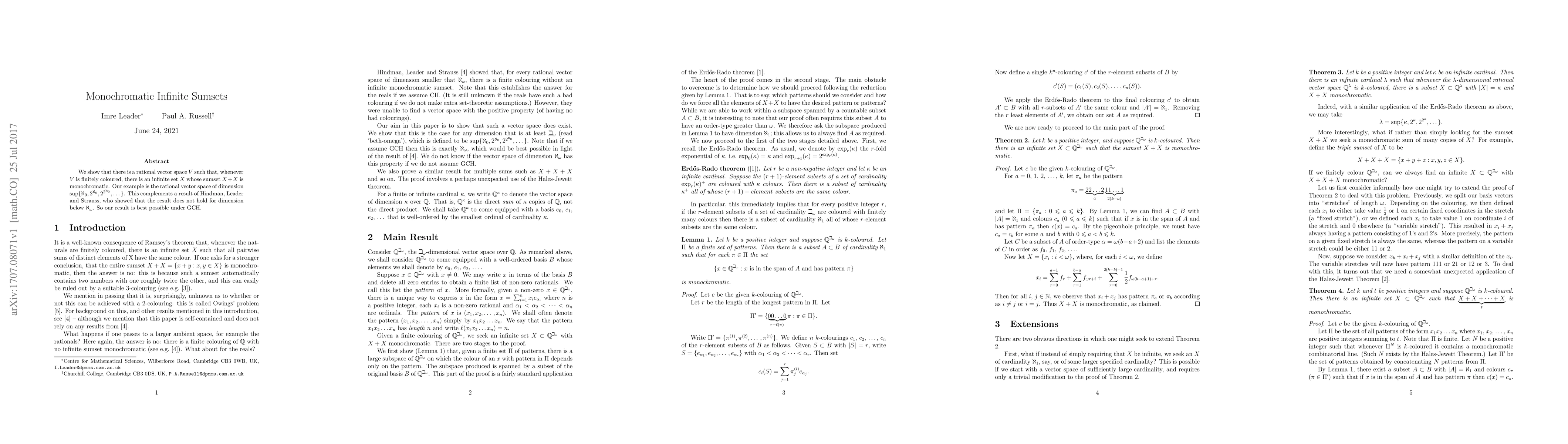 We show that there is a rational vector space $V$ such that, whenever $V$ is finitely coloured, there is an infinite set $X$ whose sumset $X+X$ is monochromatic. Our example is the rational vector space of dimension $\sup\{\aleph_0,2^{\aleph_0},2^{2^{\aleph_0}},\ldots\,\}$. This complements a result of Hindman, Leader and Strauss, who showed that the result does not hold for dimension below $\aleph_\omega$. So our result is best possible under GCH.