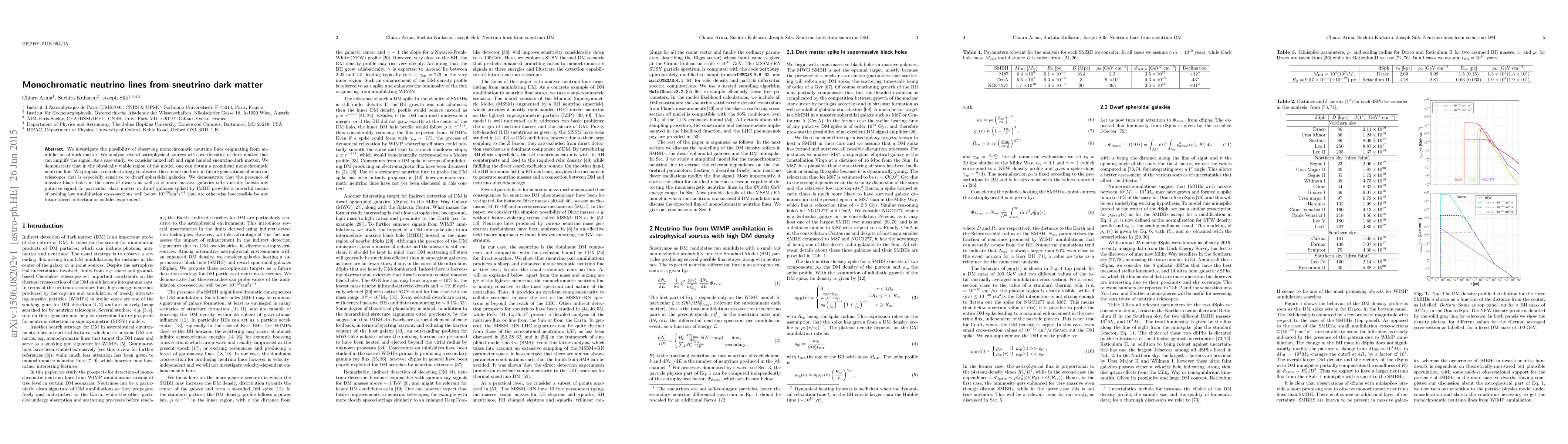 We investigate the possibility of observing monochromatic neutrino lines originating from annihilation of dark matter. We analyse several astrophysical sources with overdensities of dark matter that can amplify the signal. As a case study, we consider mixed left and right handed sneutrino dark matter. We demonstrate that in the physically viable region of the model, one can obtain a prominent monochromatic neutrino line. We propose a search strategy to observe these neutrino lines in future generations of neutrino telescopes that is especially sensitive to dwarf spheroidal galaxies. We demonstrate that the presence of massive black holes in the cores of dwarfs as well as of more massive galaxies substantially boosts any putative signal. In particular, dark matter in dwarf galaxies spiked by IMBH provides a powerful means of probing low annihilation cross-sections well below $10^{-26} \rm cm^3 s^{-1}$ that are otherwise inaccessible by any future direct detection or collider experiment.