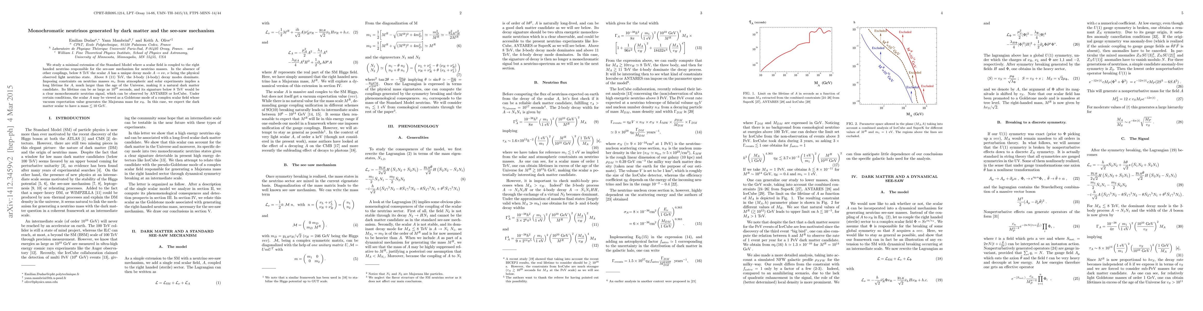 We study a minimal extension of the Standard Model where a scalar field is coupled to the right handed neutrino responsible for the see-saw mechanism for neutrino masses. In the absence of other couplings, below 8 TeV the scalar $A$ has a unique decay mode $A \rightarrow \nu \nu$, $\nu$ being the physical observed light neutrino state. Above 8 (11) TeV, the 3-body (4-body) decay modes dominate. Imposing constraints on neutrino masses $m_\nu$ from atmospheric and solar experiments implies a long lifetime for $A$, much larger than the age of the Universe, making it a natural dark matter candidate. Its lifetime can be as large as $10^{29}$ seconds, and its signature below 8 TeV would be a clear monochromatic neutrino signal, which can be observed by ANTARES or IceCube. Under certain conditions, the scalar $A$ may be viewed as a Goldstone mode of a complex scalar field whose vacuum expectation value generates the Majorana mass for $\nu_R$. In this case, we expect the dark matter scalar to have a mass $\lesssim 10$ GeV.