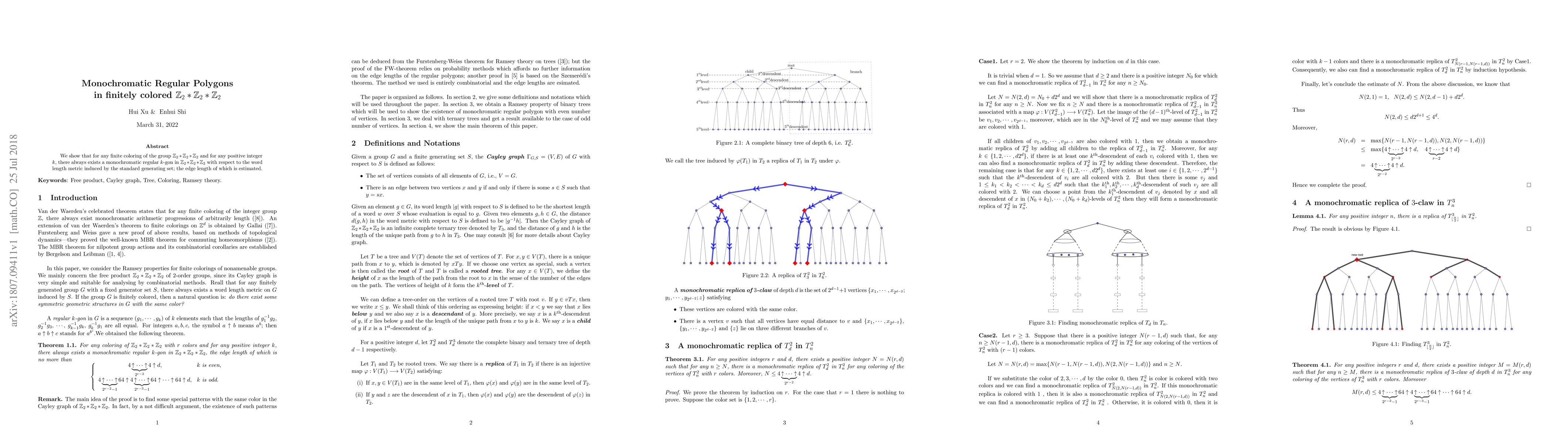 This paper demonstrates the existence of monochromatic regular $k$-gons in any finite coloring of the group $\mathbb{Z}_2 *\mathbb{Z}_2 *\mathbb{Z}_2$ for any positive integer $k$, and estimates the edge length of these polygons under the word length metric.
