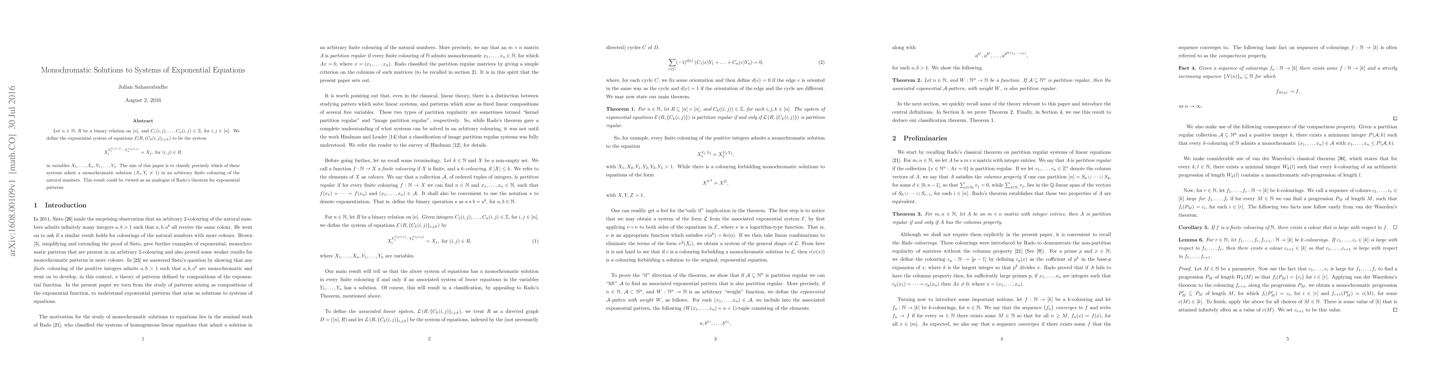 Let $n\in \mathbb{N}$, $R$ be a binary relation on $[n]$, and $C_1(i,j),\ldots,C_n(i,j) \in \mathbb{Z}$, for $i,j \in [n]$. We define the exponential system of equations $\mathcal{E}(R,(C_k(i,j)_{i,j,k})$ to be the system \[ X_i^{Y_1^{C_1(i,j)} \cdots Y_n^{C_n(i,j)} } = X_j , \text{ for } (i,j) \in R ,\] in variables $X_1,\ldots,X_n,Y_1,\ldots,Y_n$. The aim of this paper is to classify precisely which of these systems admit a monochromatic solution ($X_i,Y_i \not=1)$ in an arbitrary finite colouring of the natural numbers. This result could be viewed as an analogue of Rado's theorem for exponential patterns.