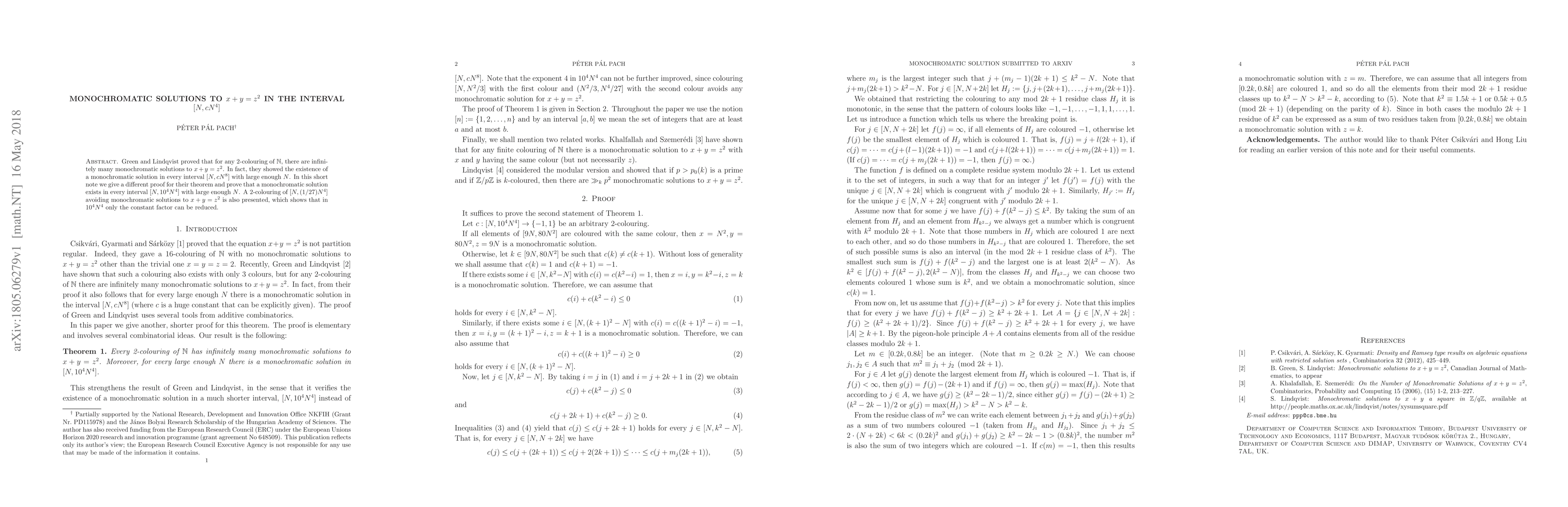 The paper presents a different proof for Green and Lindqvist's theorem, demonstrating the existence of monochromatic solutions to $x+y=z^2$ in intervals $[N,cN^8]$. The new proof shows that a monochromatic solution exists in every interval $[N,10^4N^4]$ with large enough $N$.