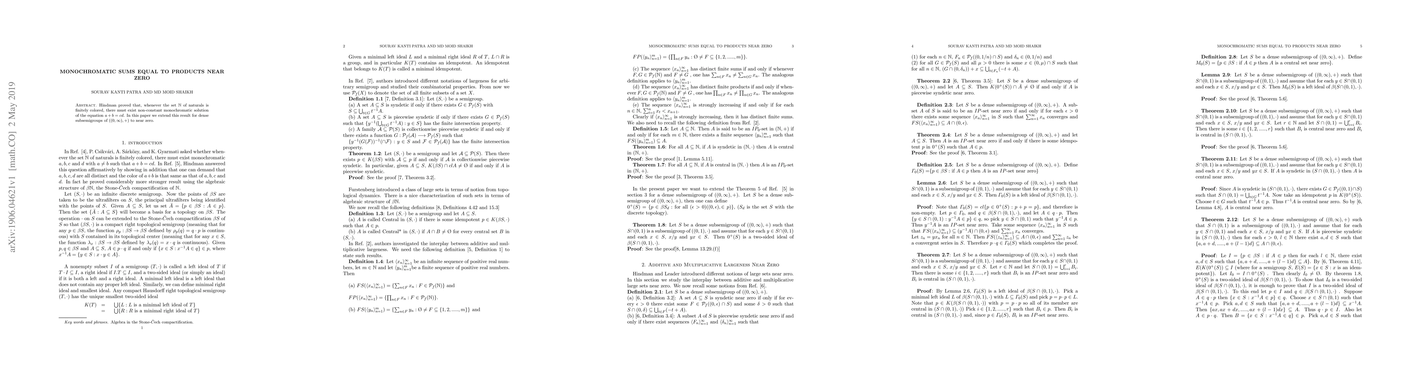 Hindman proved that, whenever the set $\mathbb{N}$ of naturals is finitely colored, there must exist non-constant monochromatic solution of the equation $a+b=cd$. In this paper we extend this result for dense subsemigroups of $((0, \infty), +)$ to near zero.