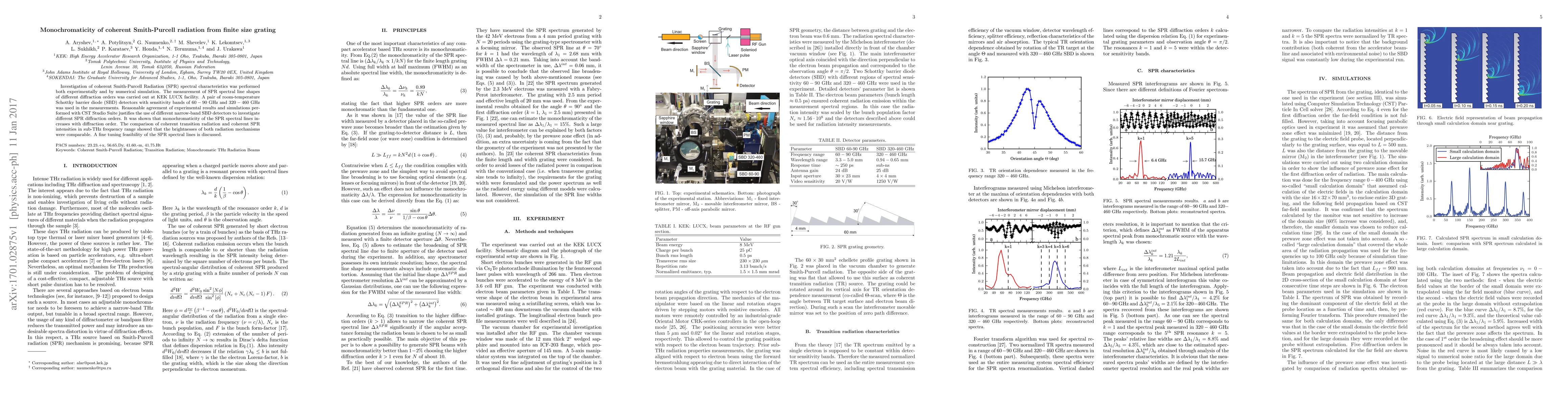 Investigation of coherent Smith-Purcell Radiation (SPR) spectral characteristics was performed both experimentally and by numerical simulation. The measurement of SPR spectral line shapes of different diffraction orders was carried out at KEK LUCX facility. A pair of room-temperature Schottky barrier diode (SBD) detectors with sensitivity bands of $60-90$~GHz and $320-460$~GHz was used in the measurements. Reasonable agreement of experimental results and simulations performed with CST Studio Suite justifies the use of different narrow-band SBD detectors to investigate different SPR diffraction orders. It was shown that monochromaticity of the SPR spectral lines increases with diffraction order. The comparison of coherent transition radiation and coherent SPR intensities in sub-THz frequency range showed that the brightnesses of both radiation mechanisms were comparable. A fine tuning feasibility of the SPR spectral lines is discussed.