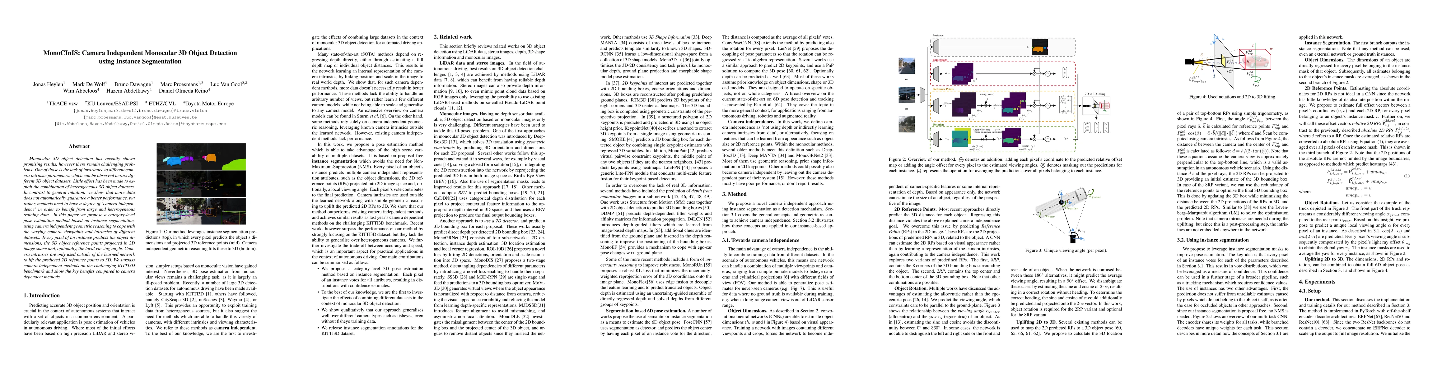 The introduction of camera-independent geometric reasoning for monocular 3D object detection using instance segmentation.