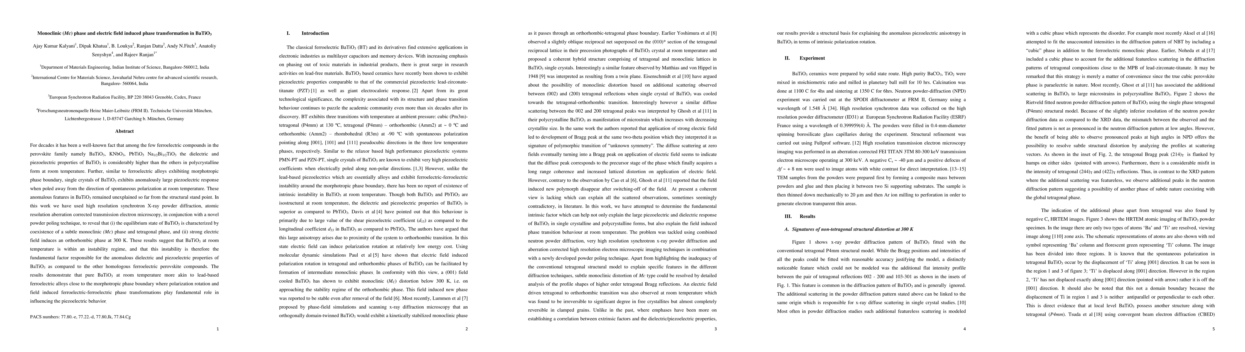 This study reveals that BaTiO3, a ferroelectric compound, exhibits a coexistence of monoclinic and tetragonal phases at room temperature, explaining its anomalous dielectric and piezoelectric properties. An electric field induces an orthorhombic phase, suggesting that room temperature BaTiO3 operates within an instability regime akin to lead-based ferroelectric alloys near the morphotropic phase boundary.