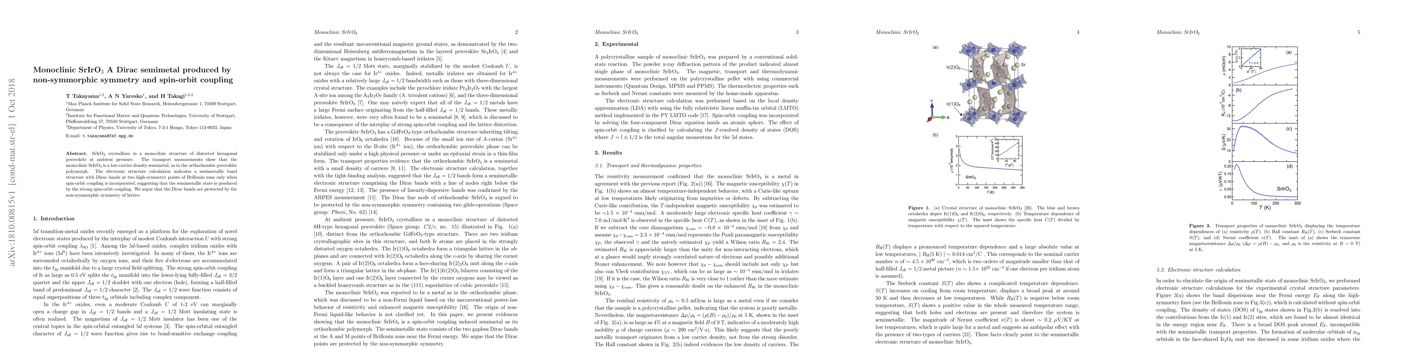 SrIrO$_3$ in monoclinic form exhibits a Dirac semimetal state due to strong spin-orbit coupling and non-symmorphic symmetry, as evidenced by its semimetallic band structure with Dirac points. This unique electronic behavior is distinct from its orthorhombic perovskite counterpart.