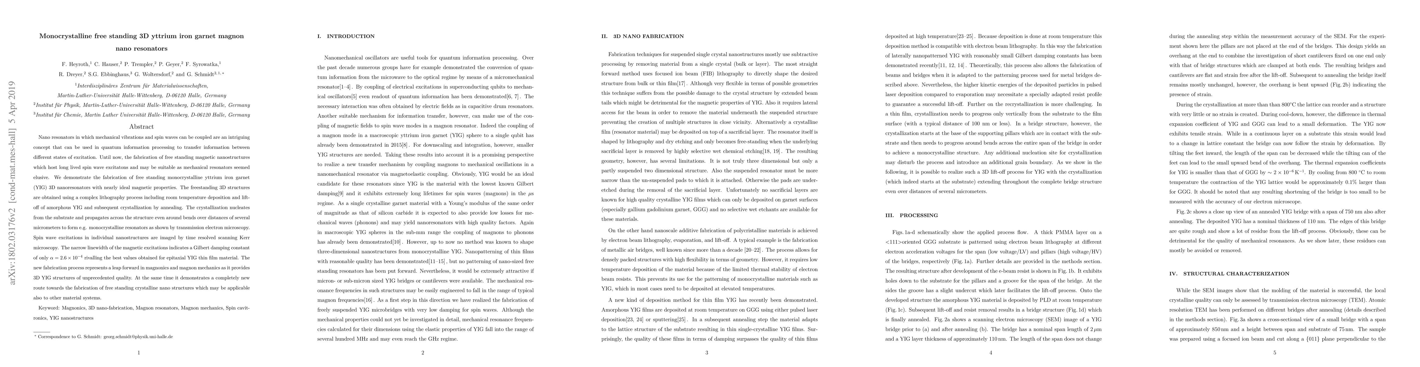 Nano resonators in which mechanical vibrations and spin waves can be coupled are an intriguing concept that can be used in quantum information processing to transfer information between different states of excitation. Until now, the fabrication of free standing magnetic nanostructures which host long lived spin wave excitatons and may be suitable as mechanical resonators seemed elusive. We demonstrate the fabrication of free standing monocrystalline yttrium iron garnet (YIG) 3D nanoresonators with nearly ideal magnetic properties. The freestanding 3D structures are obtained using a complex lithography process including room temperature deposition and lift-off of amorphous YIG and subsequent crystallization by annealing. The crystallization nucleates from the substrate and propagates across the structure even around bends over distances of several micrometers to form e.g. monocrystalline resonators as shown by transmission electron microscopy. Spin wave excitations in individual nanostructures are imaged by time resolved scanning Kerr microscopy. The narrow linewidth of the magnetic excitations indicates a Gilbert damping constant of only $\alpha = 2.6 \times 10^{-4}$ rivalling the best values obtained for epitaxial YIG thin film material. The new fabrication process represents a leap forward in magnonics and magnon mechanics as it provides 3D YIG structures of unprecedented quality. At the same time it demonstrates a completely new route towards the fabrication of free standing crystalline nano structures which may be applicable also to other material systems.