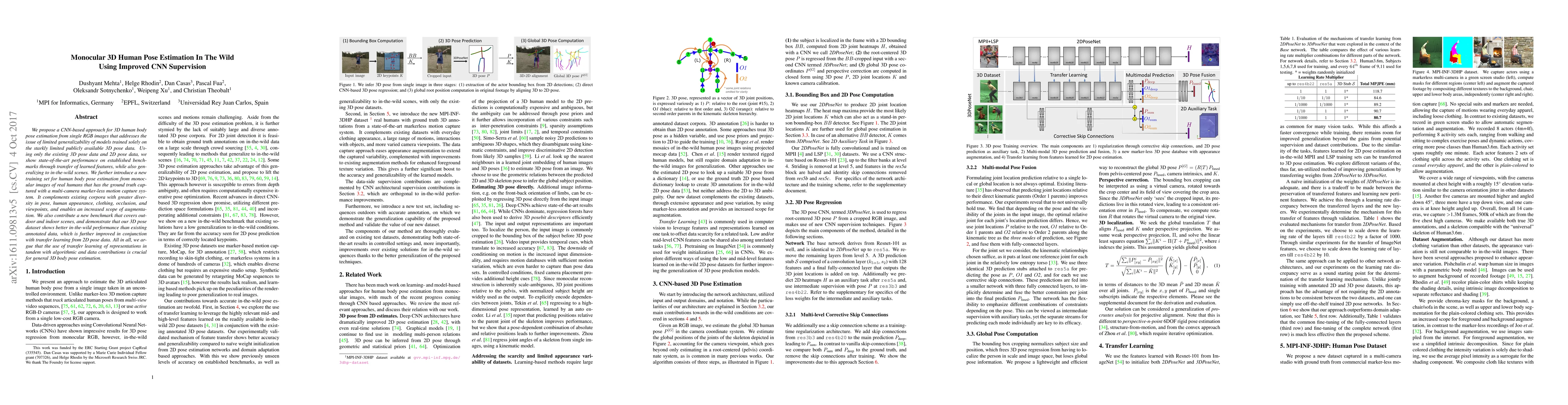 We propose a CNN-based approach for 3D human body pose estimation from single RGB images that addresses the issue of limited generalizability of models trained solely on the starkly limited publicly available 3D pose data. Using only the existing 3D pose data and 2D pose data, we show state-of-the-art performance on established benchmarks through transfer of learned features, while also generalizing to in-the-wild scenes. We further introduce a new training set for human body pose estimation from monocular images of real humans that has the ground truth captured with a multi-camera marker-less motion capture system. It complements existing corpora with greater diversity in pose, human appearance, clothing, occlusion, and viewpoints, and enables an increased scope of augmentation. We also contribute a new benchmark that covers outdoor and indoor scenes, and demonstrate that our 3D pose dataset shows better in-the-wild performance than existing annotated data, which is further improved in conjunction with transfer learning from 2D pose data. All in all, we argue that the use of transfer learning of representations in tandem with algorithmic and data contributions is crucial for general 3D body pose estimation.