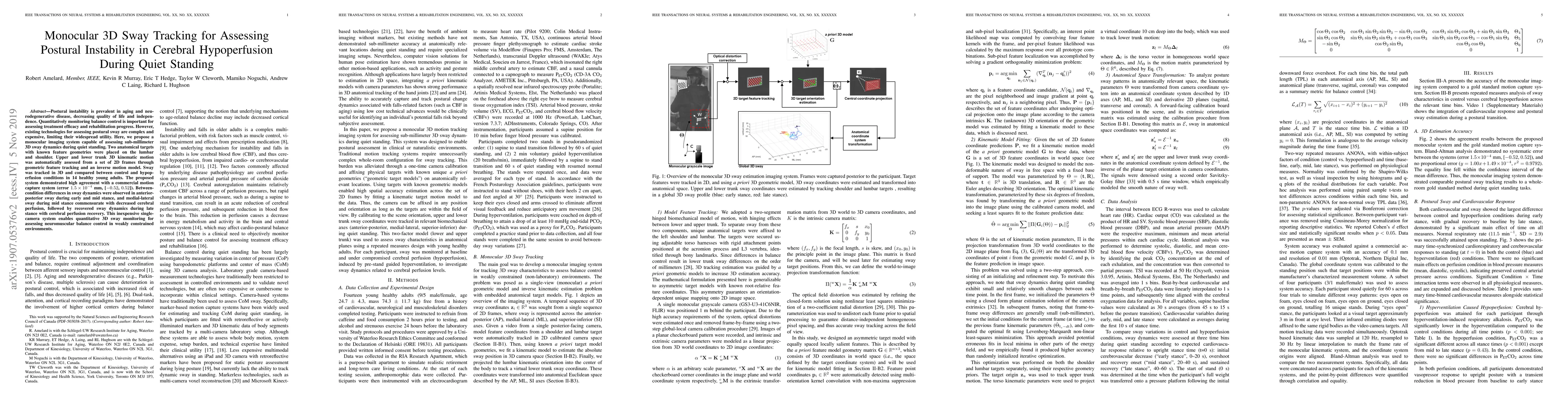This paper proposes a low-cost monocular imaging system for assessing 3D postural sway during quiet standing, using geometric feature tracking on anatomical targets on the lumbar and shoulder. The system demonstrated high accuracy compared to a commercial motion capture system, revealing significant differences in sway dynamics between control and cerebral hypoperfusion conditions in young adults.