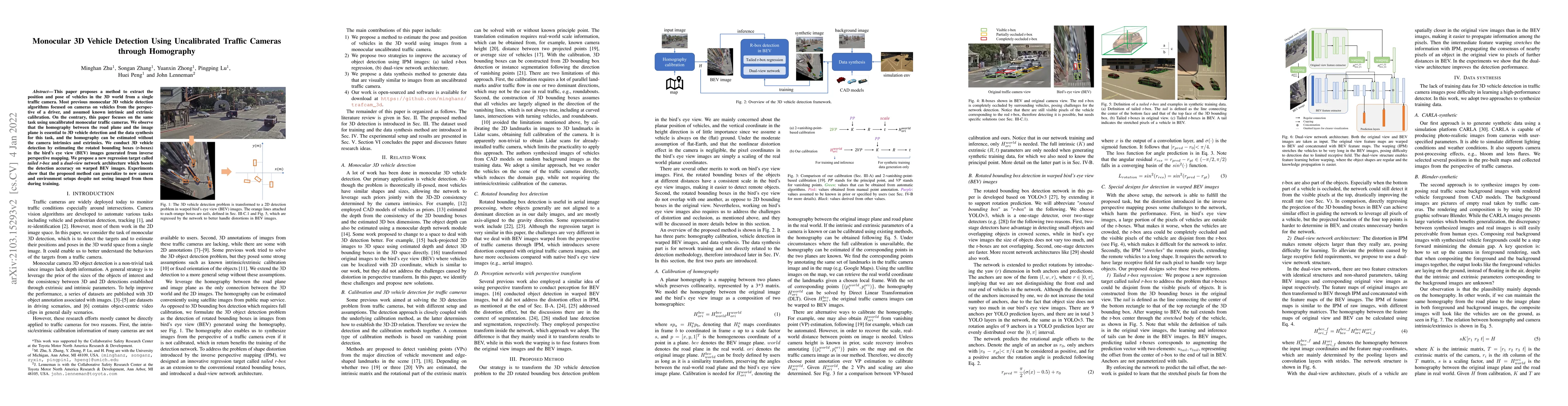 This paper presents a method for 3D vehicle detection using uncalibrated monocular traffic cameras, leveraging homography to estimate vehicle positions and poses without requiring camera calibration. The approach uses a dual-view network with tailed rotated bounding boxes for improved detection accuracy on bird's eye view images.