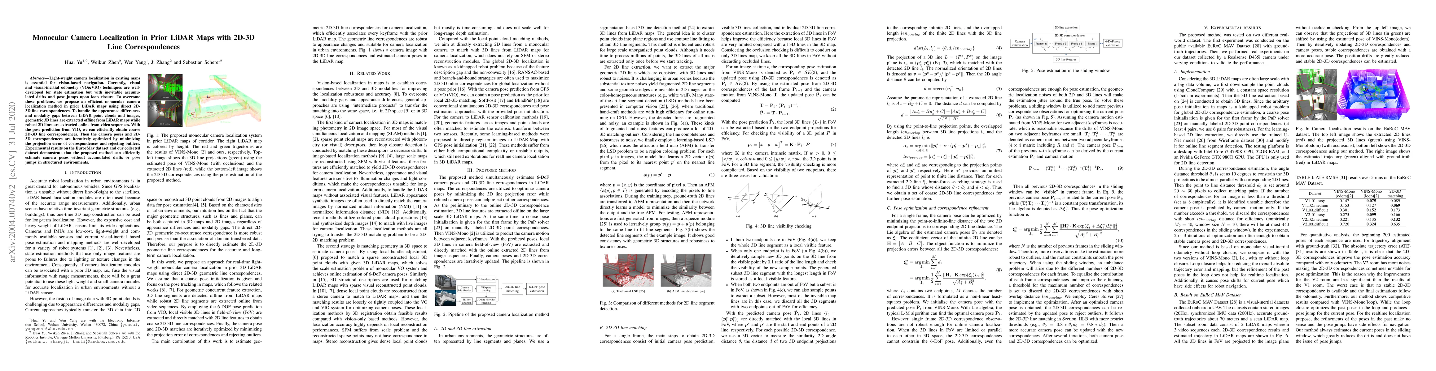 This paper proposes a monocular camera localization method using 2D-3D line correspondences in prior LiDAR maps to enhance vision-based navigation. It extracts geometric 3D lines from LiDAR maps and robust 2D lines from video sequences, optimizing camera poses and correspondences to minimize projection errors and reject outliers, achieving stable localization without drifts or jumps.