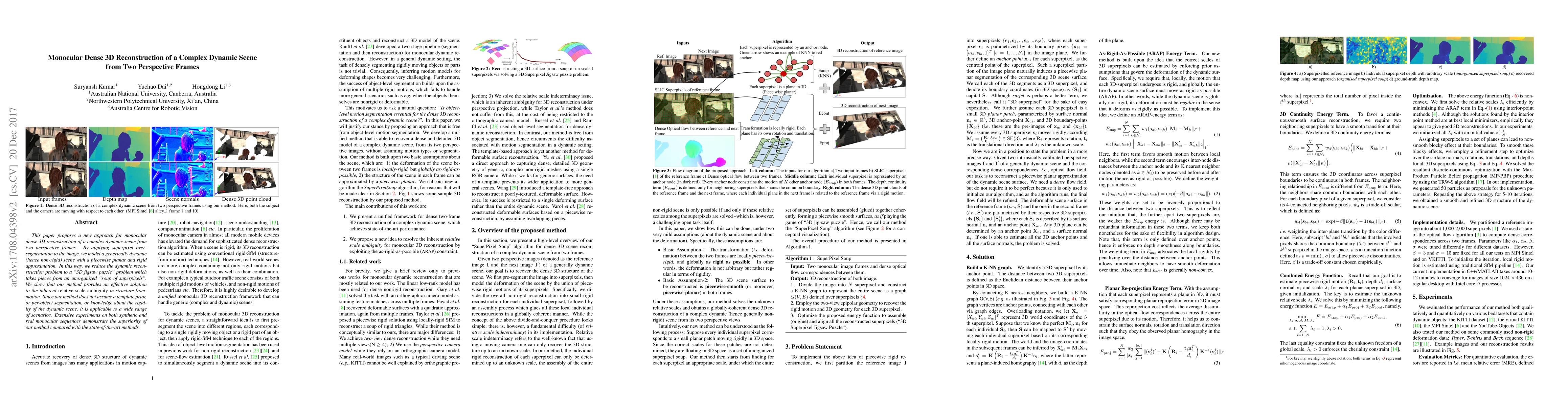 This paper introduces a novel method for monocular dense 3D reconstruction of dynamic scenes from two perspective frames, addressing relative scale ambiguity without rigid assumptions. The method segments images into superpixels and treats the scene as a jigsaw puzzle of rigid planar pieces, showing superior performance over state-of-the-art techniques in both synthetic and real-world tests.
