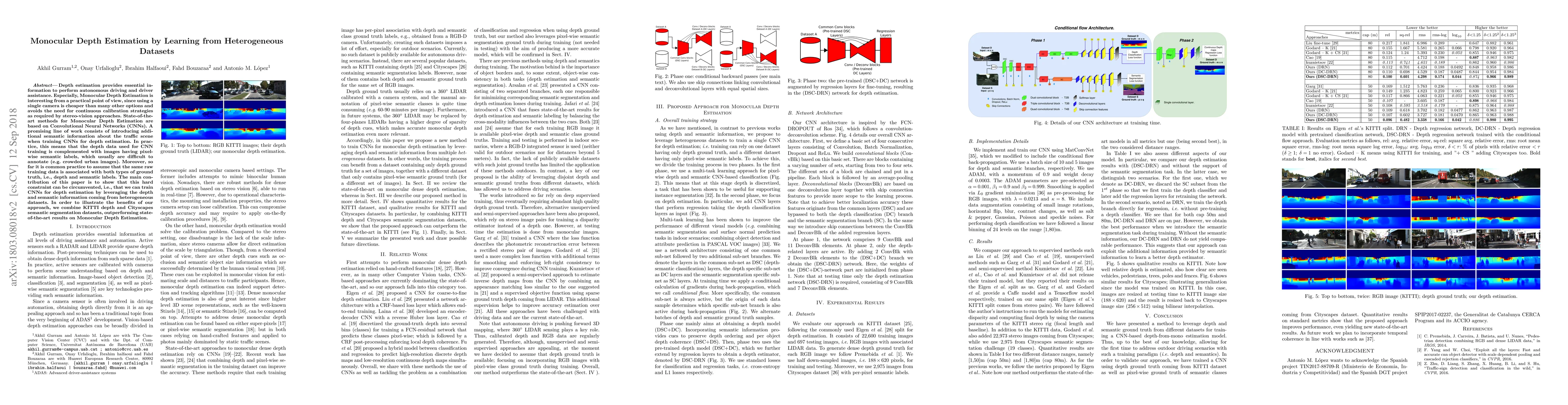 Depth estimation provides essential information to perform autonomous driving and driver assistance. Especially, Monocular Depth Estimation is interesting from a practical point of view, since using a single camera is cheaper than many other options and avoids the need for continuous calibration strategies as required by stereo-vision approaches. State-of-the-art methods for Monocular Depth Estimation are based on Convolutional Neural Networks (CNNs). A promising line of work consists of introducing additional semantic information about the traffic scene when training CNNs for depth estimation. In practice, this means that the depth data used for CNN training is complemented with images having pixel-wise semantic labels, which usually are difficult to annotate (e.g. crowded urban images). Moreover, so far it is common practice to assume that the same raw training data is associated with both types of ground truth, i.e., depth and semantic labels. The main contribution of this paper is to show that this hard constraint can be circumvented, i.e., that we can train CNNs for depth estimation by leveraging the depth and semantic information coming from heterogeneous datasets. In order to illustrate the benefits of our approach, we combine KITTI depth and Cityscapes semantic segmentation datasets, outperforming state-of-the-art results on Monocular Depth Estimation.