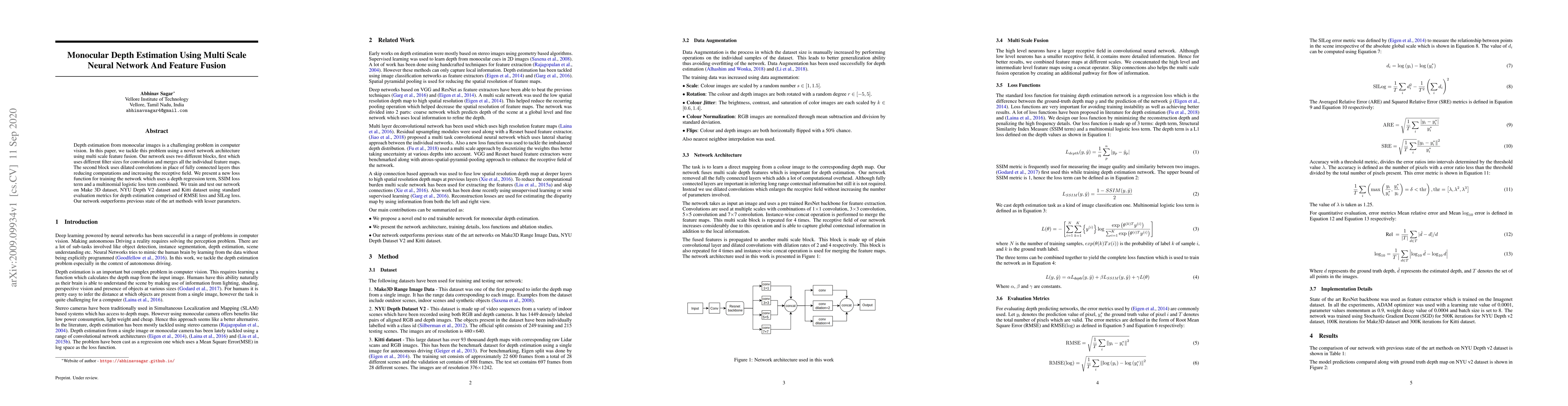 This paper presents a new method for monocular depth estimation using a multi-scale neural network with feature fusion, achieving better performance than previous state-of-the-art methods with fewer parameters.