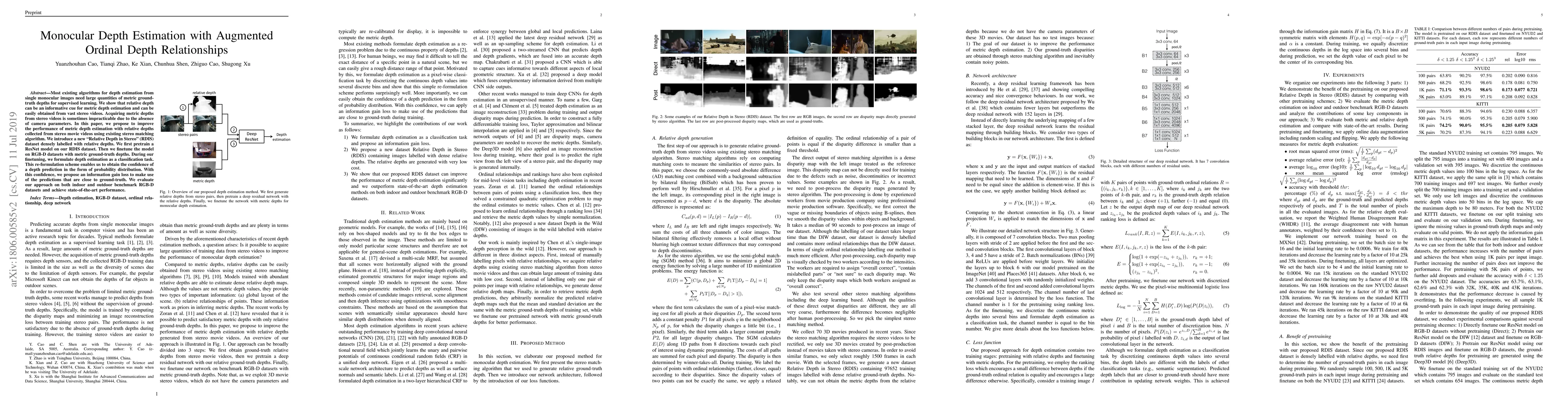 Most existing algorithms for depth estimation from single monocular images need large quantities of metric groundtruth depths for supervised learning. We show that relative depth can be an informative cue for metric depth estimation and can be easily obtained from vast stereo videos. Acquiring metric depths from stereo videos is sometimes impracticable due to the absence of camera parameters. In this paper, we propose to improve the performance of metric depth estimation with relative depths collected from stereo movie videos using existing stereo matching algorithm. We introduce a new "Relative Depth in Stereo" (RDIS) dataset densely labelled with relative depths. We first pretrain a ResNet model on our RDIS dataset. Then we finetune the model on RGB-D datasets with metric ground-truth depths. During our finetuning, we formulate depth estimation as a classification task. This re-formulation scheme enables us to obtain the confidence of a depth prediction in the form of probability distribution. With this confidence, we propose an information gain loss to make use of the predictions that are close to ground-truth. We evaluate our approach on both indoor and outdoor benchmark RGB-D datasets and achieve state-of-the-art performance.