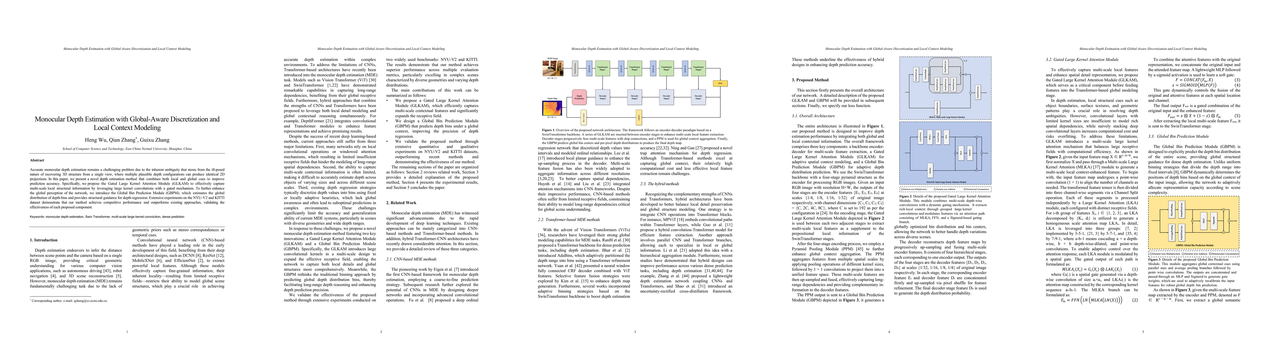 Accurate monocular depth estimation remains a challenging problem due to the inherent ambiguity that stems from the ill-posed nature of recovering 3D structure from a single view, where multiple plausible depth configurations can produce identical 2D projections. In this paper, we present a novel depth estimation method that combines both local and global cues to improve prediction accuracy. Specifically, we propose the Gated Large Kernel Attention Module (GLKAM) to effectively capture multi-scale local structural information by leveraging large kernel convolutions with a gated mechanism. To further enhance the global perception of the network, we introduce the Global Bin Prediction Module (GBPM), which estimates the global distribution of depth bins and provides structural guidance for depth regression. Extensive experiments on the NYU-V2 and KITTI dataset demonstrate that our method achieves competitive performance and outperforms existing approaches, validating the effectiveness of each proposed component.