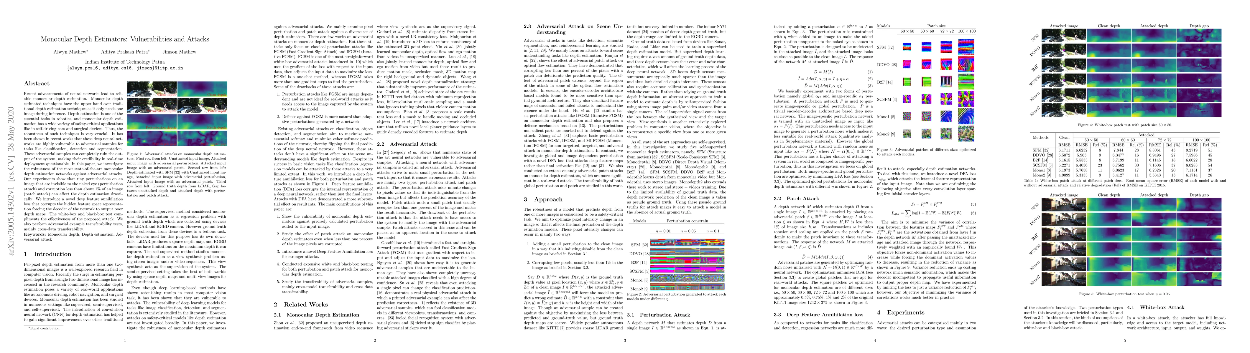 The paper investigates the robustness of state-of-the-art monocular depth estimation networks against adversarial attacks using both perturbation and patch attacks. It introduces a novel deep feature annihilation loss (DFA) to corrupt the hidden feature space representation, forcing the decoder to output poor depth maps.