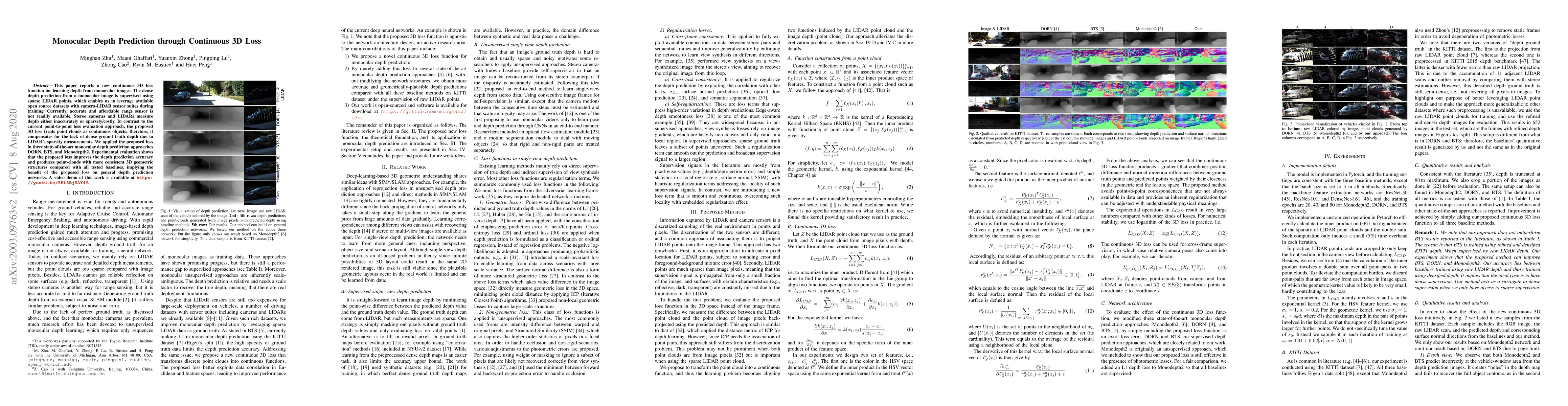 This paper introduces a novel continuous 3D loss function for monocular depth prediction, which treats point clouds as continuous objects to improve accuracy over sparse LIDAR measurements. The proposed loss enhances depth prediction accuracy and 3D geometric consistency across several state-of-the-art monocular depth prediction methods.