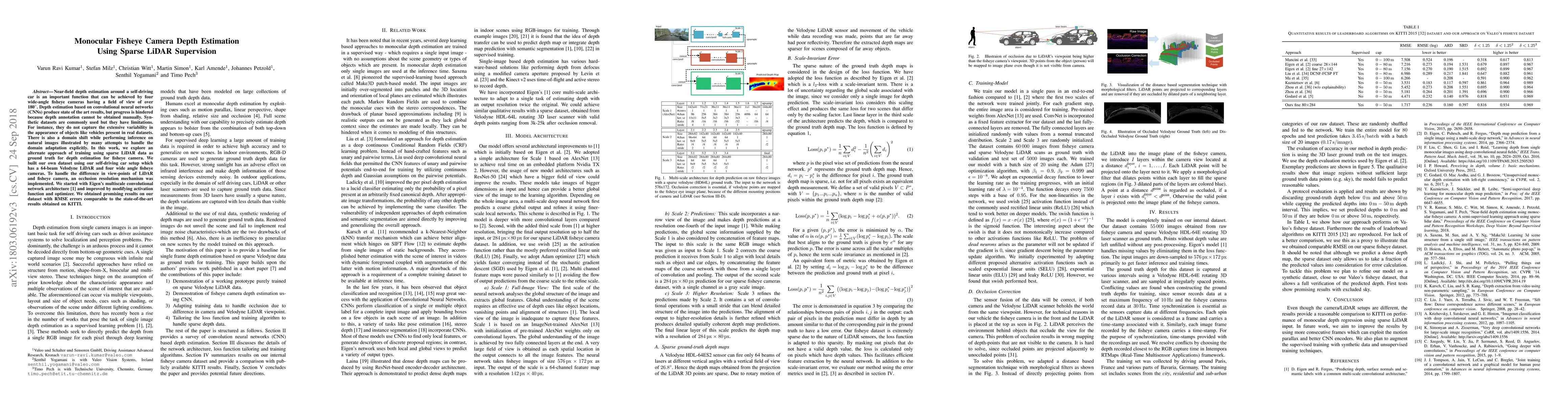 This paper proposes a method for depth estimation using monocular fisheye cameras in self-driving cars, leveraging sparse LiDAR data for training. The approach addresses domain shift issues and achieves state-of-the-art results on the authors' custom dataset, with RMSE errors comparable to those on the KITTI dataset.