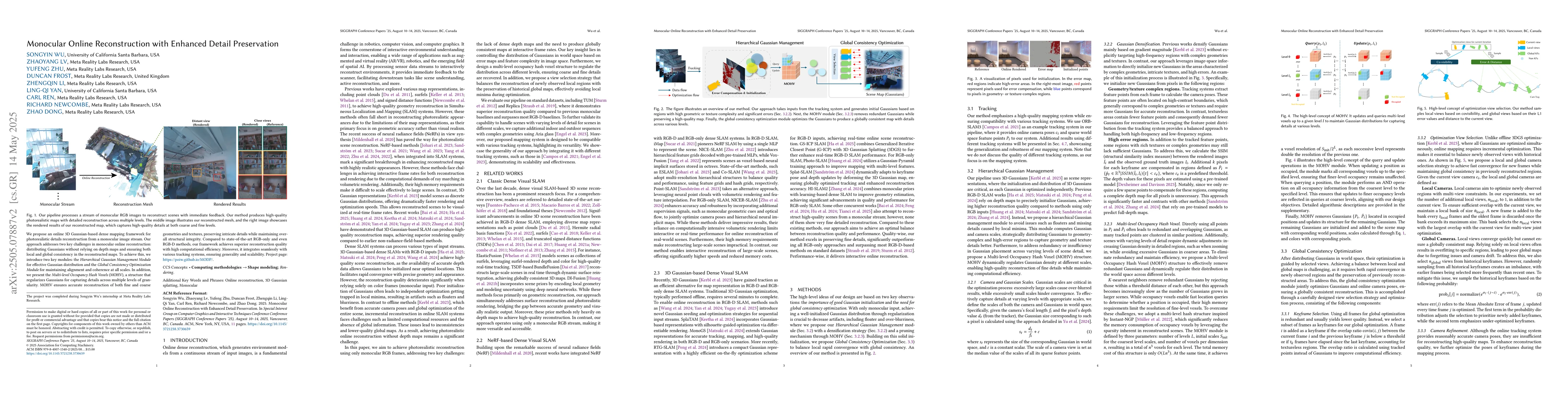 This paper proposes a monocular online reconstruction framework that preserves detailed textures while maintaining overall structural integrity, achieving superior reconstruction quality with high efficiency.