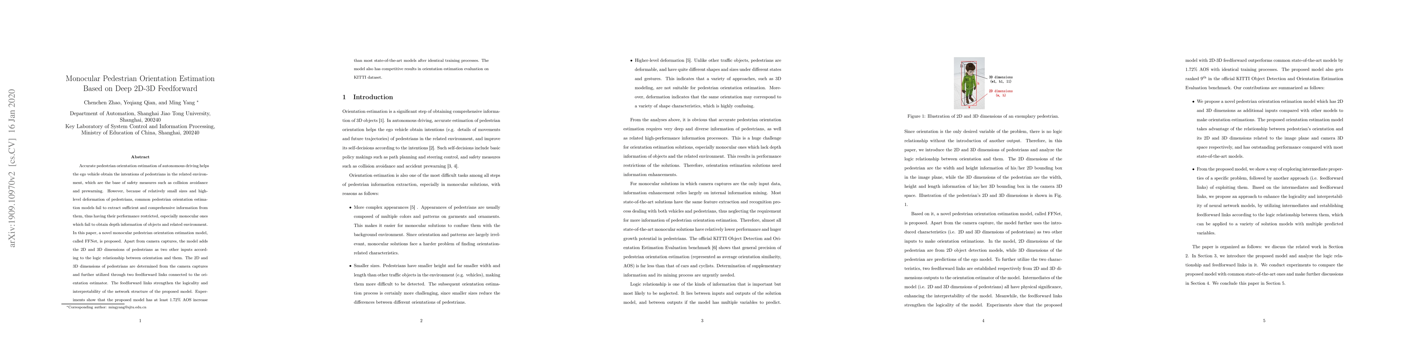 This paper proposes FFNet, a novel monocular pedestrian orientation estimation model that incorporates 2D and 3D dimensions to enhance accuracy. The model outperforms existing methods, achieving at least a 1.72% improvement in accuracy on the KITTI dataset.