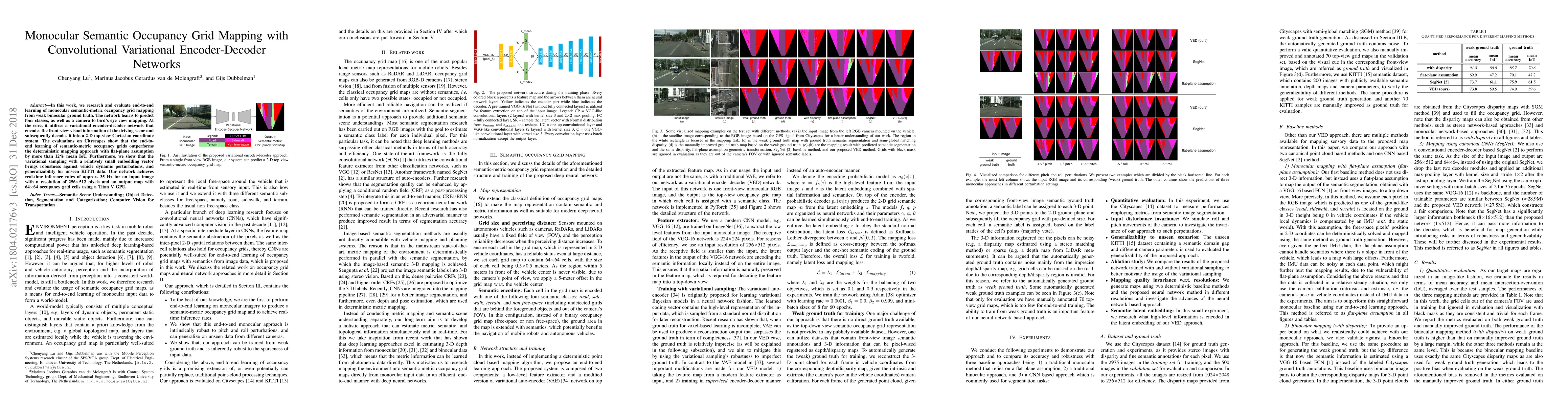 This paper proposes a convolutional variational encoder-decoder network for end-to-end learning of monocular semantic-metric occupancy grid mapping, achieving better performance than deterministic methods by over 12% mean IoU on Cityscapes. The network demonstrates real-time inference at 35 Hz and robustness against dynamic vehicle perturbations.