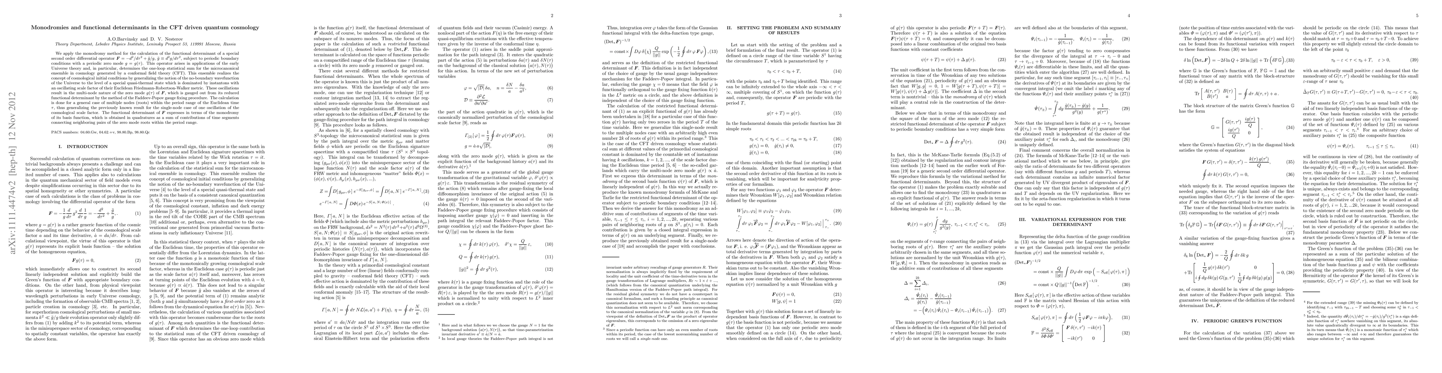We apply the monodromy method for the calculation of the functional determinant of a special second order differential operator $F=-d^2/d\tau^2+{\ddot g}/g$, $\ddot g= d^2g/d\tau^2$, subject to periodic boundary conditions with a periodic zero mode $g=g(\tau)$. This operator arises in applications of the early Universe theory and, in particular, determines the one-loop statistical sum for the microcanonical ensemble in cosmology generated by a conformal field theory (CFT). This ensemble realizes the concept of cosmological initial conditions by generalizing the notion of the no-boundary wavefunction of the Universe to the level of a special quasi-thermal state which is dominated by instantons with an oscillating scale factor of their Euclidean Friedmann-Robertson-Walker metric. These oscillations result in the multi-node nature of the zero mode $g(\tau)$ of $F$, which is gauged out from its reduced functional determinant by the method of the Faddeev-Popov gauge fixing procedure. The calculation is done for a general case of multiple nodes (roots) within the period range of the Euclidean time $\tau$, thus generalizing the previously known result for the single-node case of one oscillation of the cosmological scale factor. The functional determinant of $F$ expresses in terms of the monodromy of its basis function, which is obtained in quadratures as a sum of contributions of time segments connecting neighboring pairs of the zero mode roots within the period range.