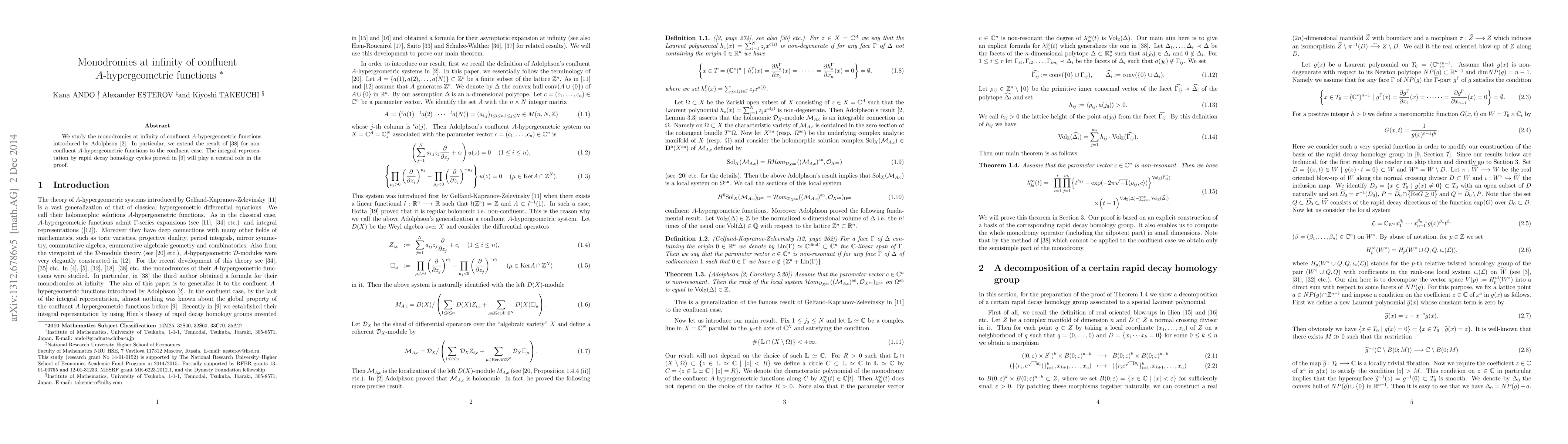This paper investigates the monodromies at infinity of confluent A-hypergeometric functions introduced by Adolphson, extending previous results for non-confluent cases. The study utilizes integral representation via rapid decay homology cycles to achieve the proof.