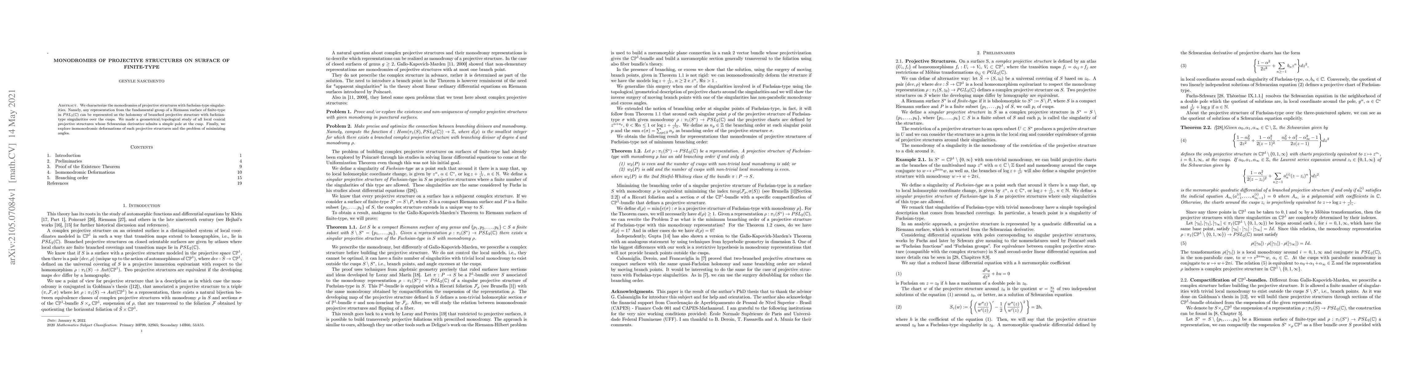 This paper characterizes the monodromies of projective structures on Riemann surfaces of finite-type with fuchsian-type singularities, showing that any representation from the fundamental group can be represented as the holonomy of such structures. It also studies local conical projective structures and explores isomonodromic deformations, focusing on minimizing angles.