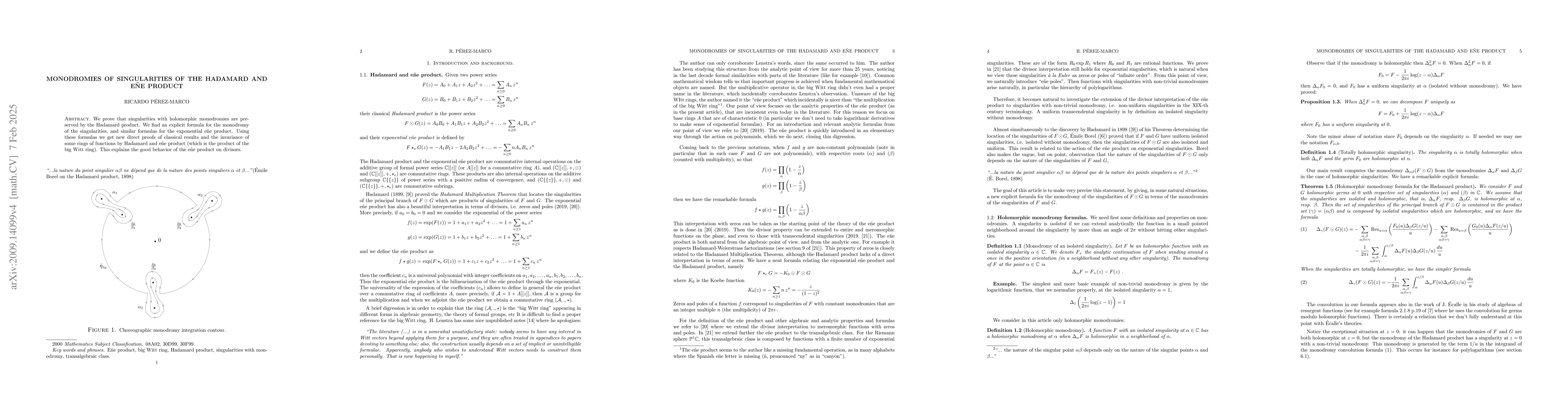 This paper proves that singularities with holomorphic monodromies remain unchanged under the Hadamard product and provides an explicit formula for their monodromy. It also finds similarly well-behaved formulas for the e~ne product, offering new proofs of classical results and demonstrating the invariance of certain function rings under these products.