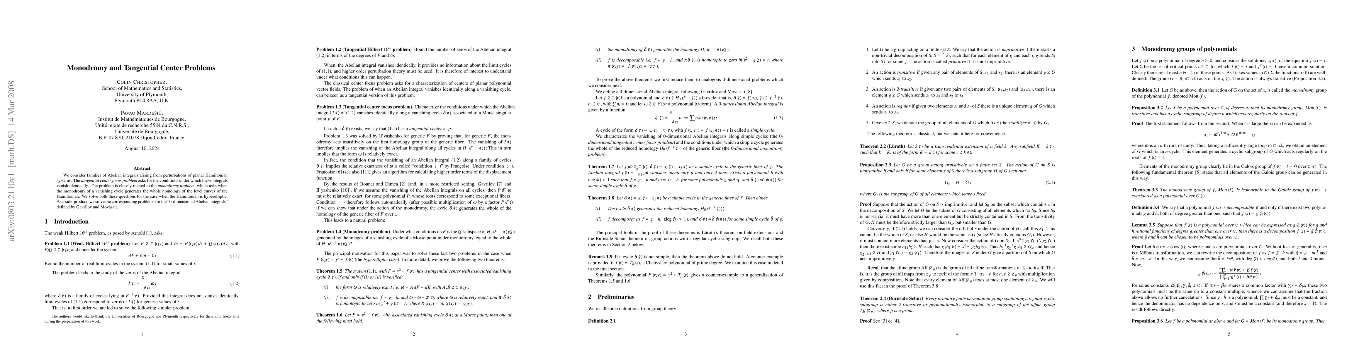 This paper addresses the tangential center focus problem and the monodromy problem in perturbed planar Hamiltonian systems, specifically for hyperelliptic Hamiltonians. It resolves these issues and also solves related problems for "0-dimensional Abelian integrals" as defined by Gavrilov and Movasati.