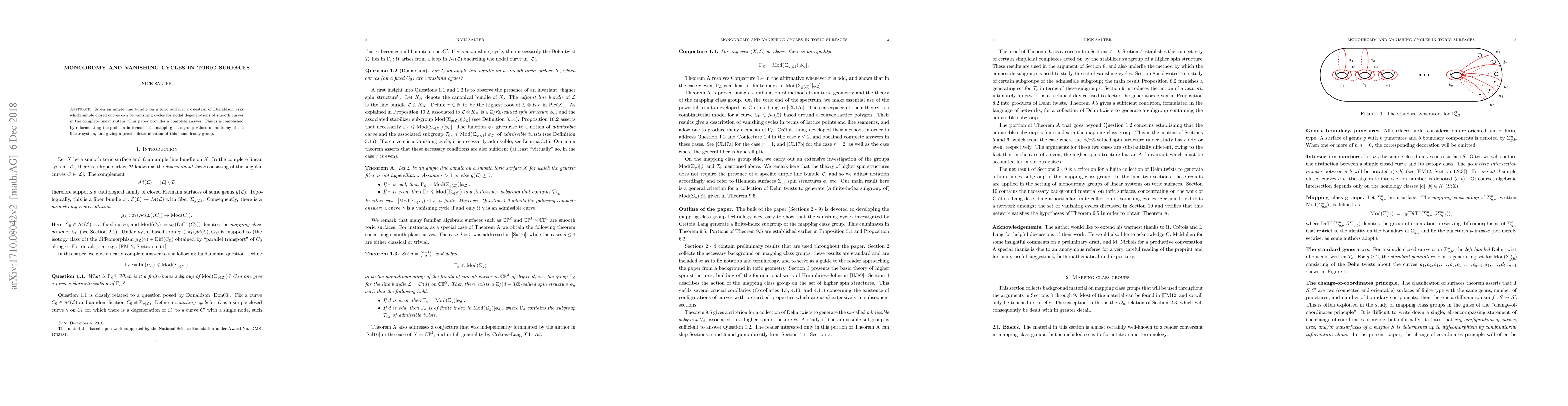 This paper resolves Donaldson's question about which simple closed curves can be vanishing cycles in nodal degenerations of smooth curves on toric surfaces by reformulating the problem using the mapping class group-valued monodromy of the linear system and determining the precise structure of this monodromy group.