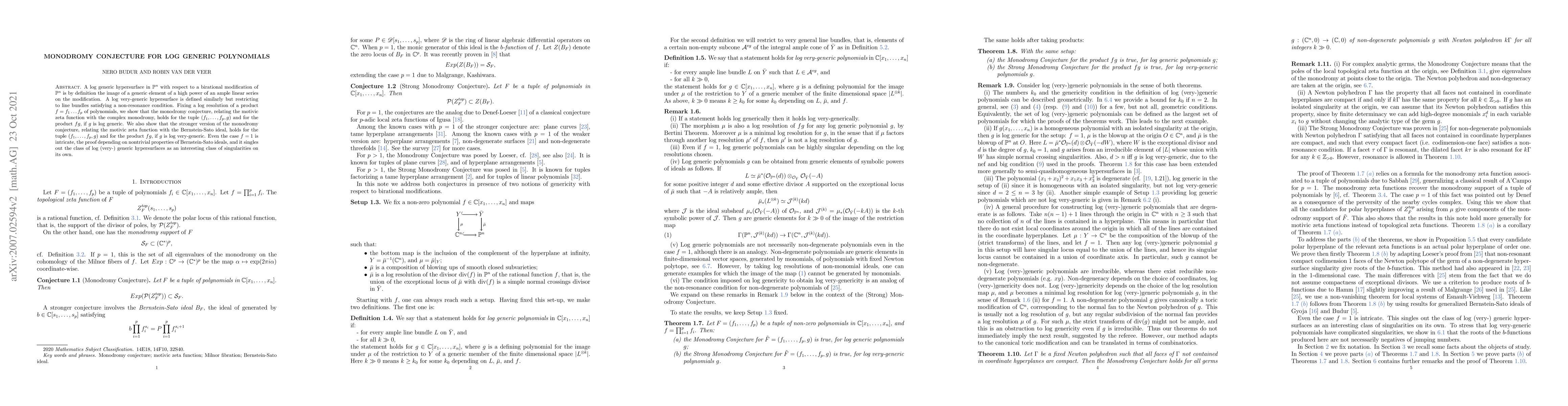 A log generic hypersurface in $\mathbb{P}^n$ with respect to a birational modification of $\mathbb{P}^n$ is by definition the image of a generic element of a high power of an ample linear series on the modification. A log very-generic hypersurface is defined similarly but restricting to line bundles satisfying a non-resonance condition. Fixing a log resolution of a product $f=f_1\ldots f_p$ of polynomials, we show that the monodromy conjecture, relating the motivic zeta function with the complex monodromy, holds for the tuple $(f_1,\ldots,f_p,g)$ and for the product $fg$, if $g$ is log generic. We also show that the stronger version of the monodromy conjecture, relating the motivic zeta function with the Bernstein-Sato ideal, holds for the tuple $(f_1,\ldots,f_p,g)$ and for the product $fg$, if $g$ is log very-generic.