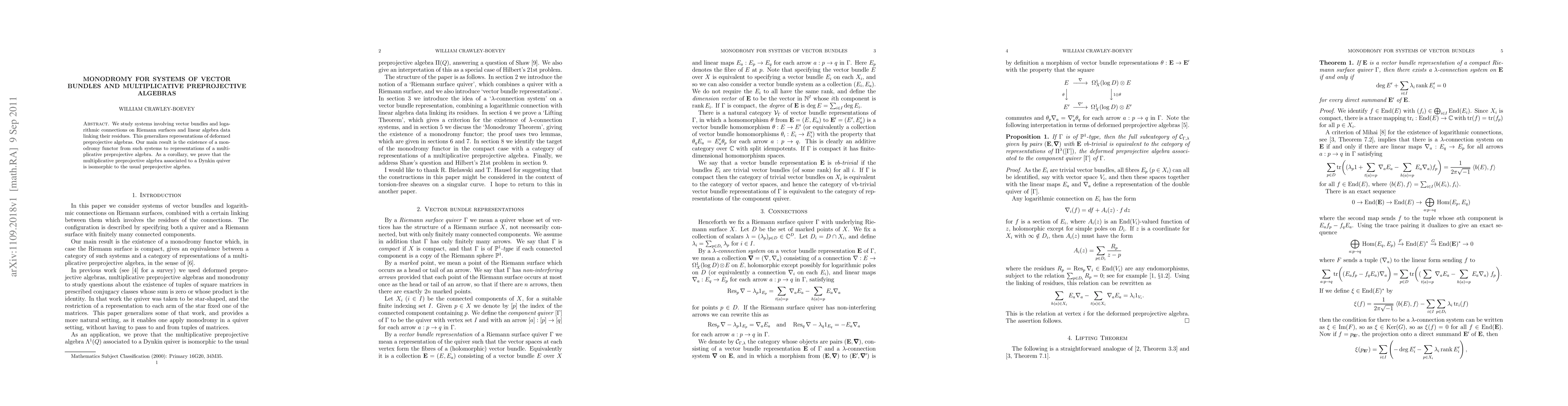 Summary: This paper explores systems of vector bundles and logarithmic connections on Riemann surfaces, establishing a monodromy functor linking them to representations of multiplicative preprojective algebras, and proves the isomorphism of the multiplicative preprojective algebra to the usual preprojective algebra for Dynkin quivers.