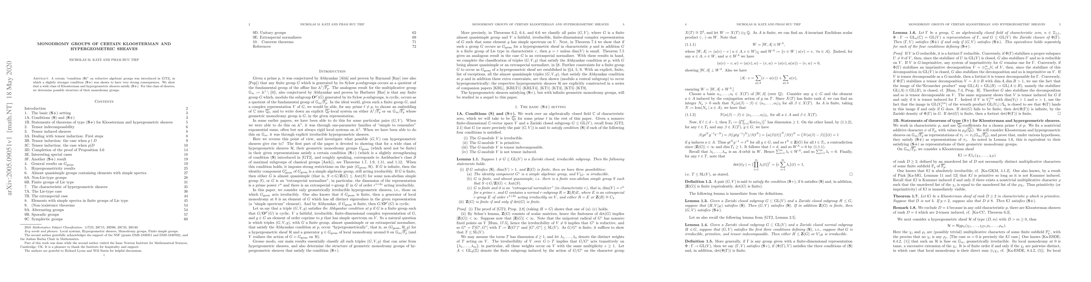 This paper investigates the "condition (S+)" for reductive algebraic groups and demonstrates that many Kloosterman and hypergeometric sheaves meet this condition. It then determines the potential structure of the monodromy groups for this class of sheaves.
