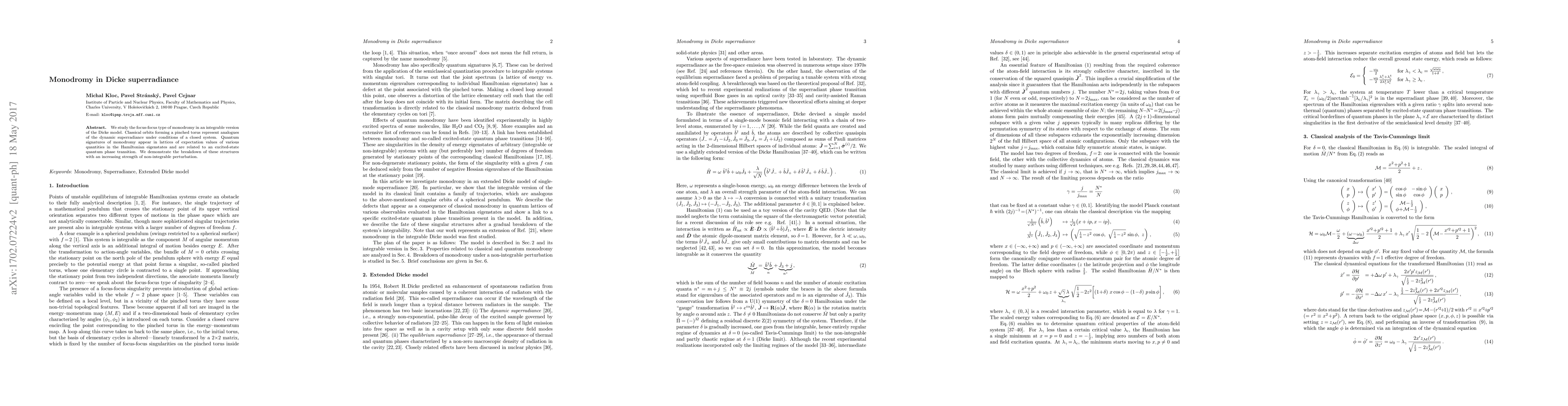 This paper investigates the monodromy in an integrable Dicke model, highlighting its classical and quantum signatures related to dynamic superradiance and an excited-state quantum phase transition, which breaks down with non-integrable perturbations.