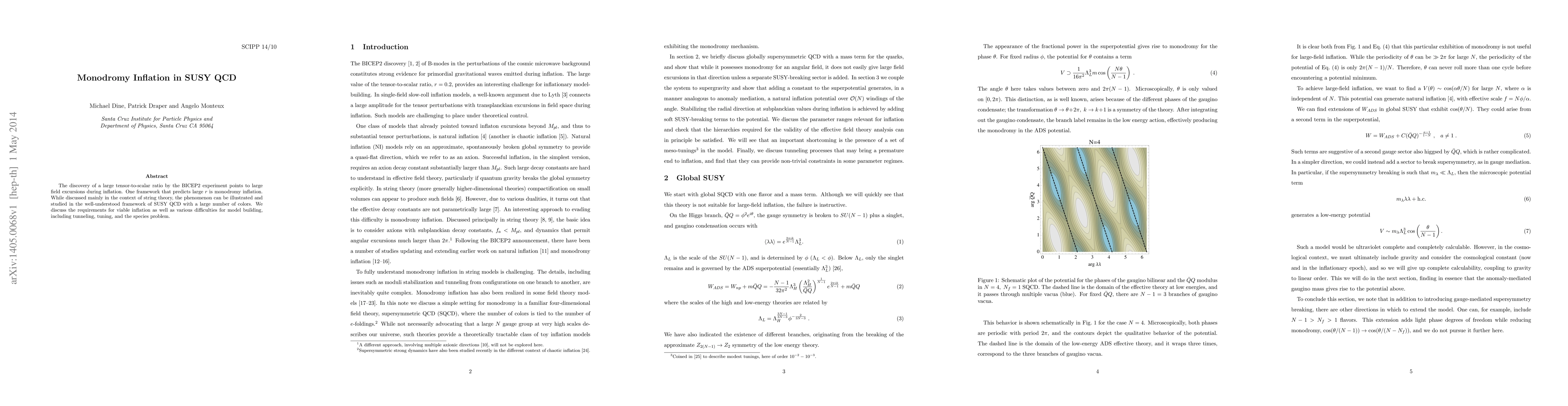 The paper explores monodromy inflation in Supersymmetric Quantum Chromodynamics (SUSY QCD), a framework suggesting large tensor-to-scalar ratio (r) as observed by BICEP2. It discusses the conditions for successful inflation and challenges like tunneling, fine-tuning, and the species problem in this model.