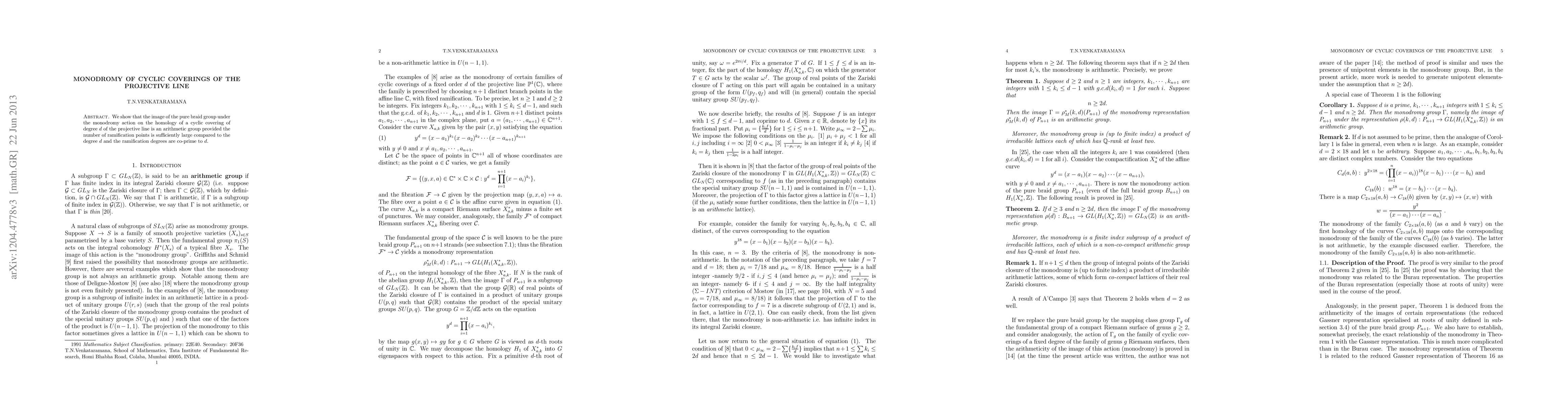 Researchers prove that a specific group of transformations on a cyclic covering of the projective line forms an arithmetic group when branch points are sufficiently large compared to the degree.