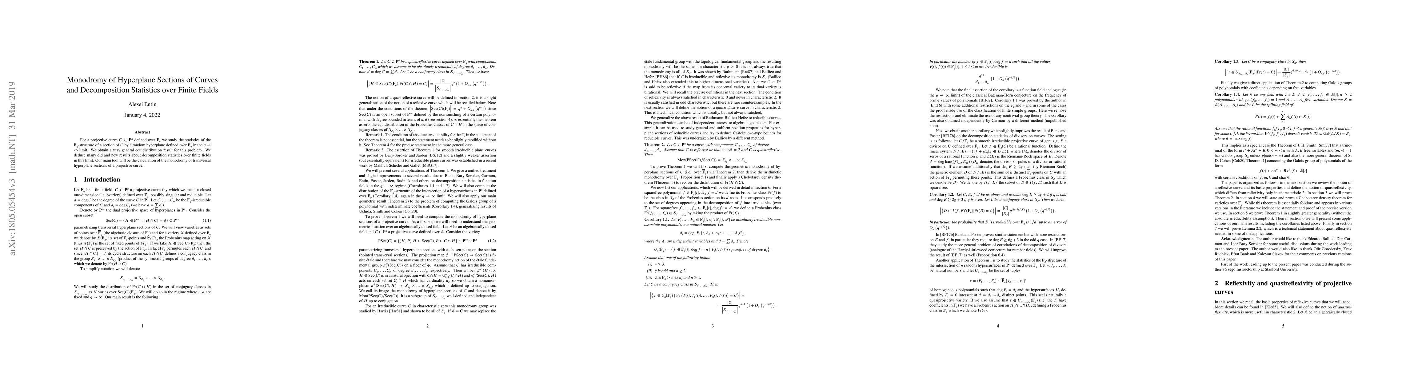 This paper investigates the statistical behavior of sections of a projective curve by random hyperplanes over finite fields, focusing on the $q\to\infty$ limit. It derives an equidistribution result for the $\mathbf{F}_q$-structure of these sections and uses monodromy calculations to establish new insights into decomposition statistics over finite fields.