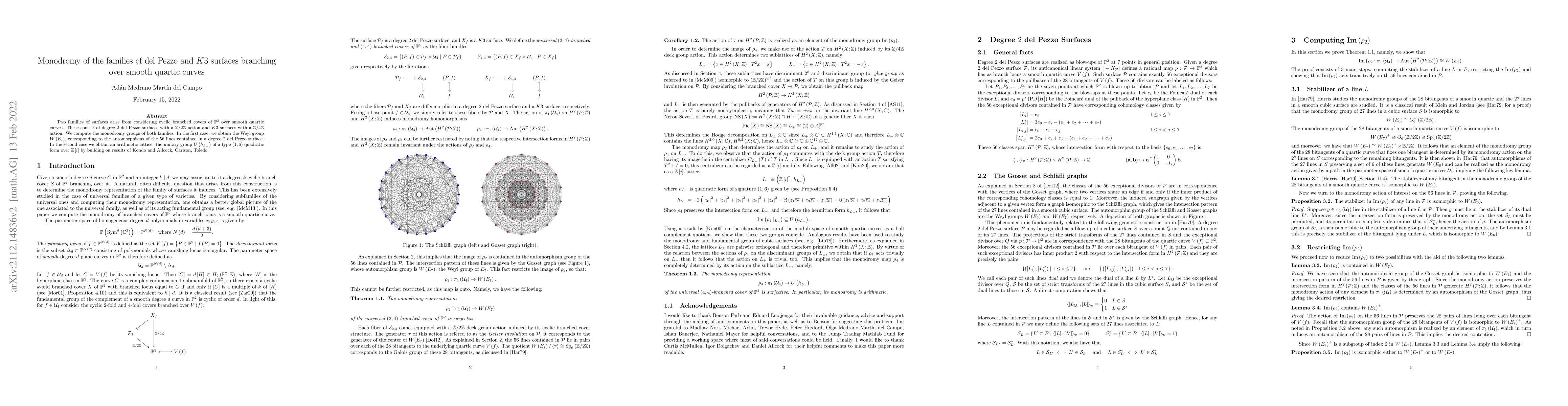 Summary: This paper investigates cyclic branched covers of $\mathbb{P}^{2}$ over smooth quartic curves, leading to families of del Pezzo and $K3$ surfaces. The monodromy group for the del Pezzo surfaces is found to be $W(E_7)$, while for $K3$ surfaces it is the unitary group $U(h_{L_{-}})$ of a type $(1, 6)$ quadratic form over $\mathbb{Z}[i]$.