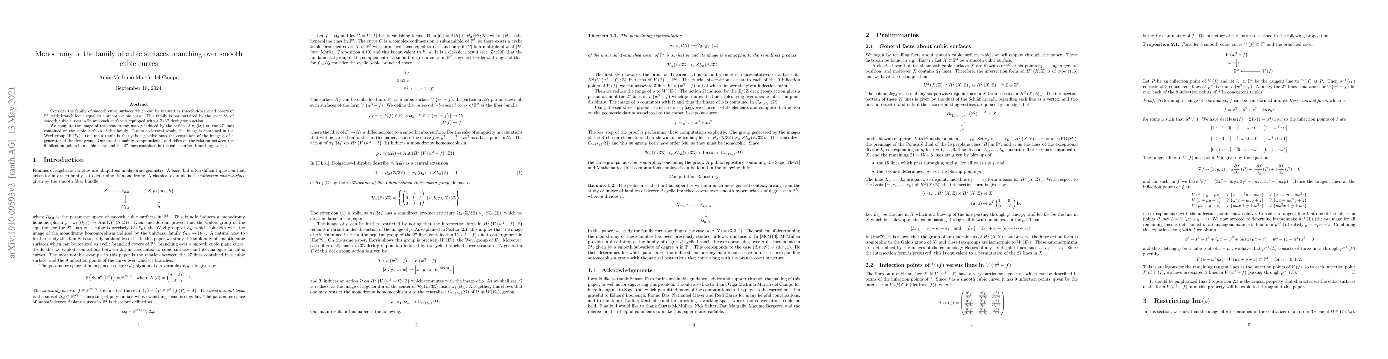 This paper studies the monodromy of smooth cubic surfaces realized as threefold-branched covers over $\mathbb{P}^{2}$ with a smooth cubic curve as the branch locus. The authors compute the image of the monodromy map $\rho$ and prove it is surjective onto the centralizer of a generator's image in the Weyl group $W(E_{6})$.