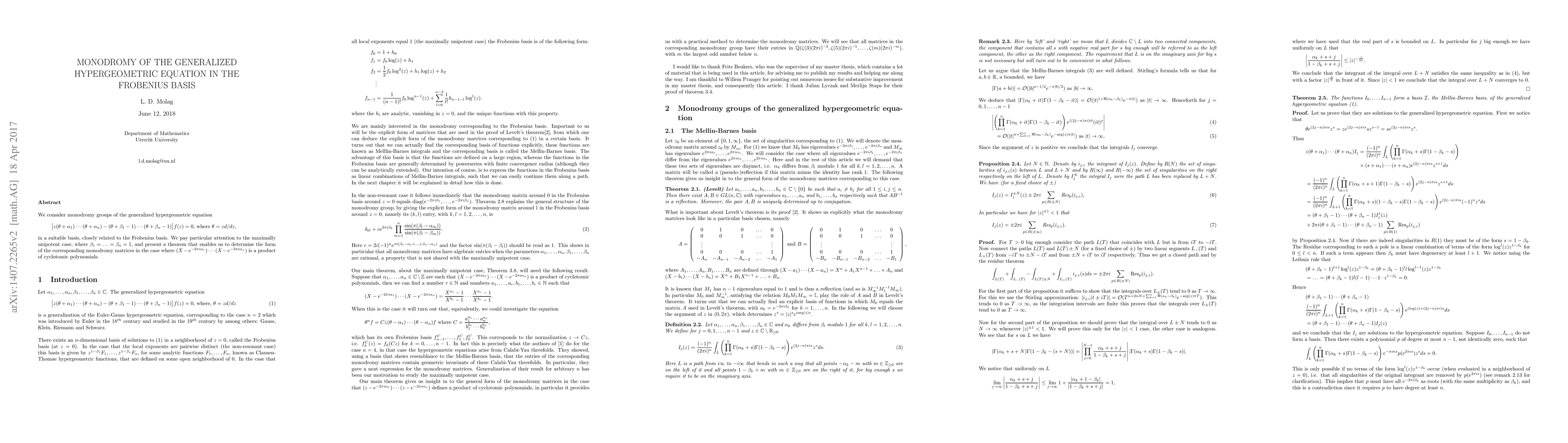 This paper investigates the monodromy groups of the generalized hypergeometric equation in the Frobenius basis, focusing on the maximally unipotent case. It presents a theorem to determine the form of monodromy matrices when certain conditions on the parameters are met, specifically when the polynomial factors are cyclotomic.