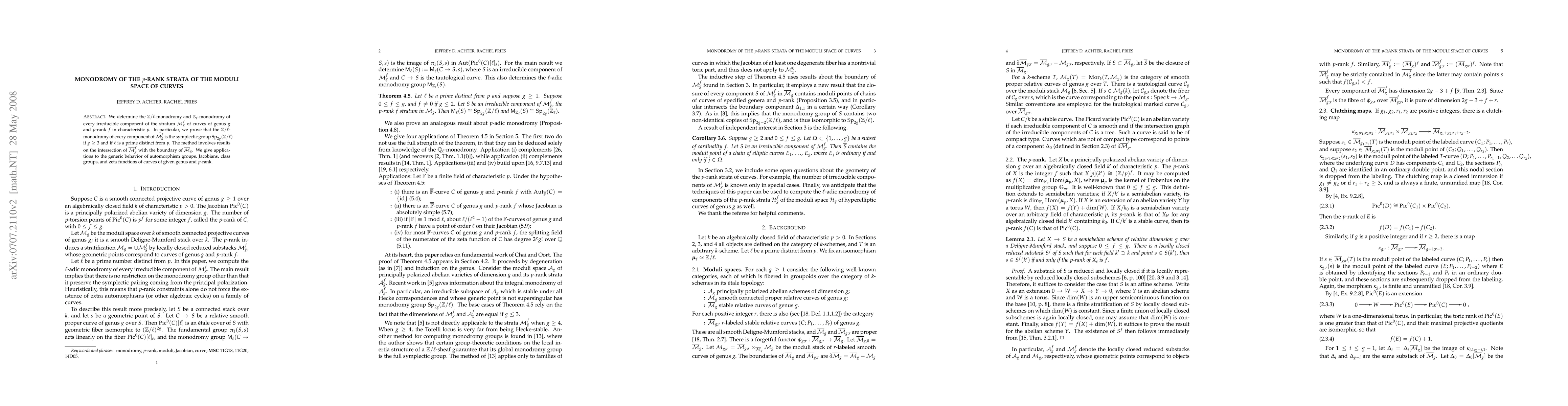 This paper computes the monodromy of p-rank strata in the moduli space of curves, showing that the Z/\ell-monodromy for components of M_g^f is the symplectic group Sp_{2g}(Z/\ell) when g is at least 3 and \ell is a distinct prime. It also discusses applications to automorphism groups, Jacobians, class groups, and zeta functions of curves.