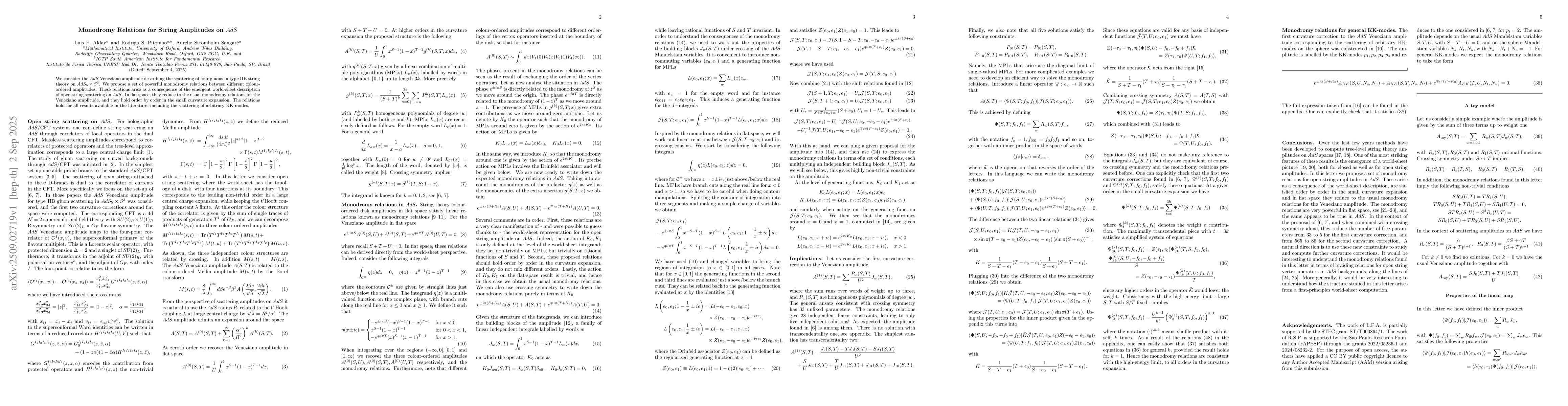 We consider the $AdS$ Veneziano amplitude describing the scattering of four gluons in type IIB string theory on $AdS_5 \times S^3$. We propose a set of powerful monodromy relations between different colour-ordered amplitudes. These relations arise as a consequence of the emergent world-sheet description of open string scattering on $AdS$. In flat space, they reduce to the usual monodromy relations for the Veneziano amplitude, and they hold order by order in the small curvature expansion. The relations hold for all results available in the literature, including the scattering of arbitrary KK-modes.