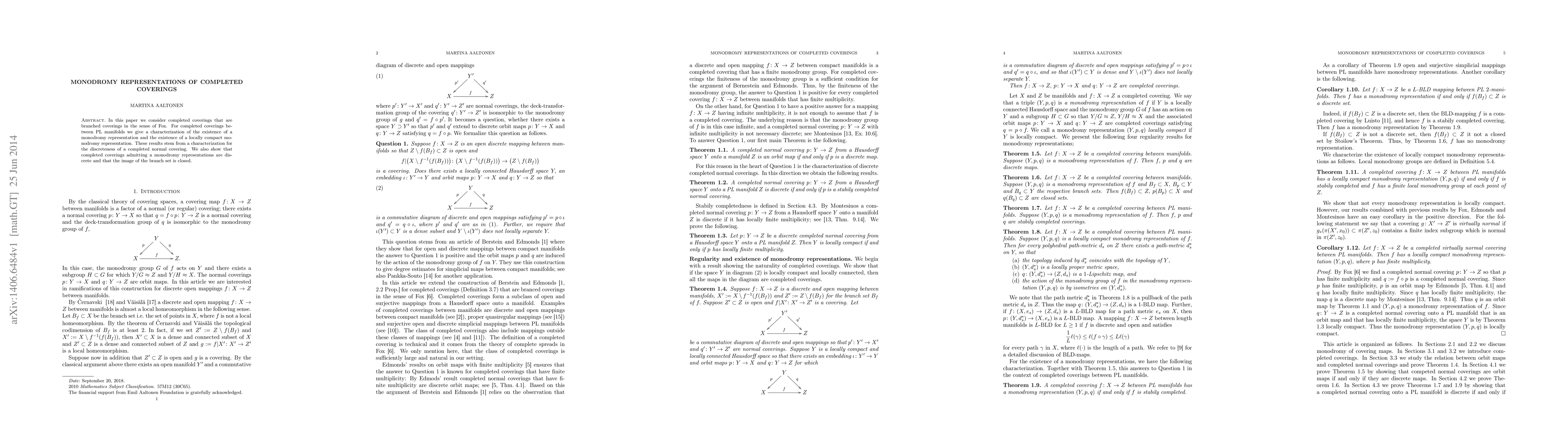 This paper characterizes completed branched coverings between PL manifolds, establishing conditions for the existence of monodromy and locally compact monodromy representations, and proving that such coverings are discrete with closed images of branch sets.