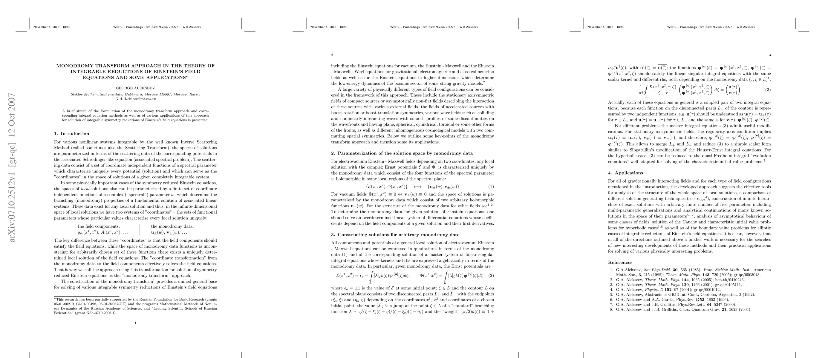 This paper introduces the monodromy transform approach and integral equation methods for solving integrable symmetry reductions of Einstein's field equations, demonstrating its applications in theoretical physics.