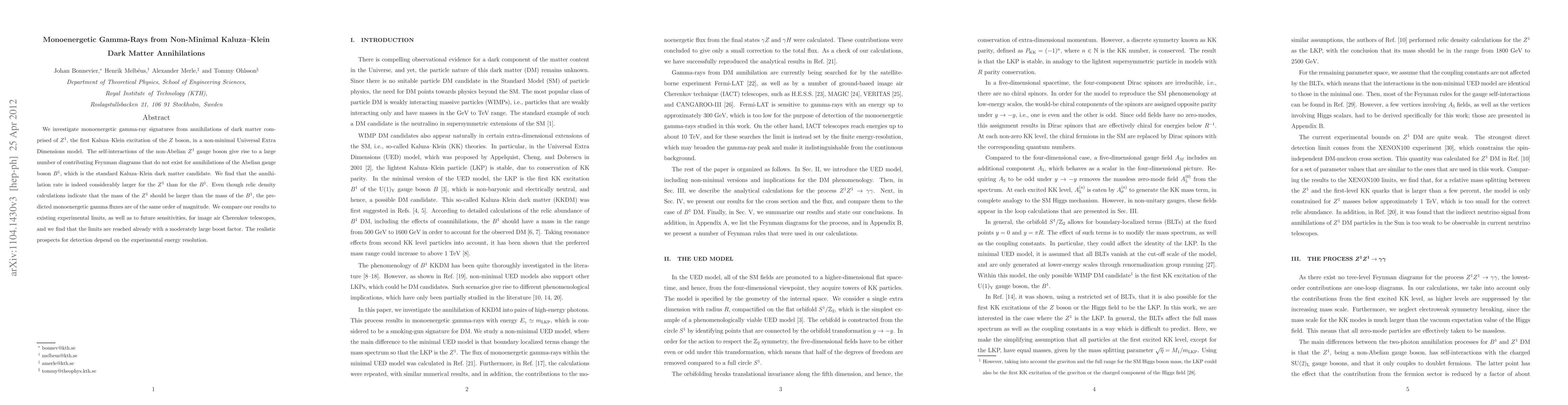 We investigate monoenergetic gamma-ray signatures from annihilations of dark matter comprised of Z^1, the first Kaluza-Klein excitation of the Z boson, in a non-minimal Universal Extra Dimensions model. The self-interactions of the non-Abelian Z^1 gauge boson give rise to a large number of contributing Feynman diagrams that do not exist for annihilations of the Abelian gauge boson B^1, which is the standard Kaluza-Klein dark matter candidate. We find that the annihilation rate is indeed considerably larger for the Z^1 than for the B^1. Even though relic density calculations indicate that the mass of the Z^1 should be larger than the mass of the B^1, the predicted monoenergetic gamma fluxes are of the same order of magnitude. We compare our results to existing experimental limits, as well as to future sensitivities, for image air Cherenkov telescopes, and we find that the limits are reached already with a moderately large boost factor. The realistic prospects for detection depend on the experimental energy resolution.
